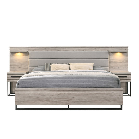 Alvear Upholstered Wood Wallbed Bed with White LED Lights, 2 Nightstands, Weathered Gray