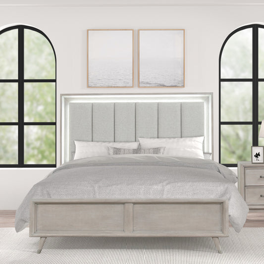 Roundhill Furniture Seluna LED Lighting Panel Bed, Upholstered Headbord, Gray Oak Finish