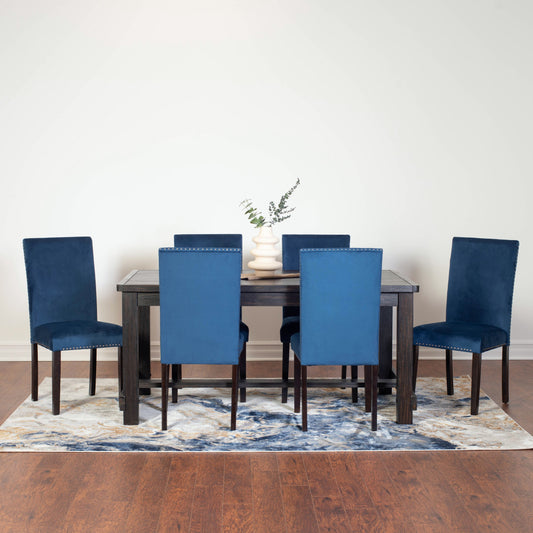 Biony Espresso Wood Dining Set with Blue Fabric Nailhead Chairs
