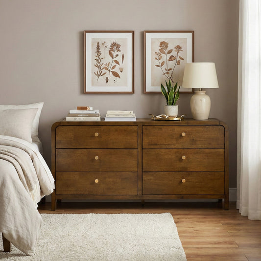 Roundhill Furniture Eldren 6-Drawer Wood Dresser with Solid Rubberwood Frame, Walnut Finish