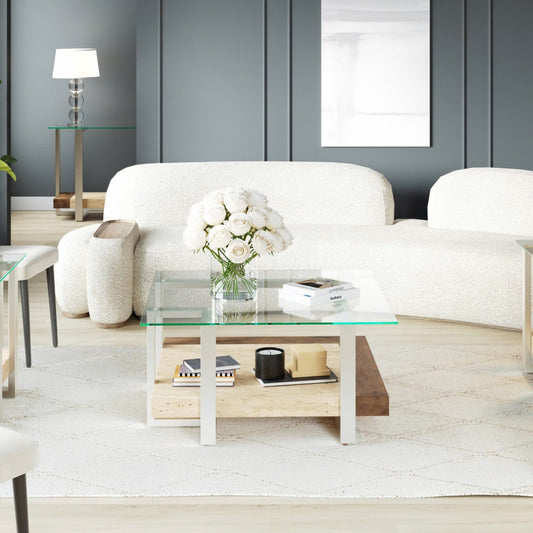 Roundhill Furniture Andes Glass Square Coffee Table with Marble Shelf, Polished Nickel Finish