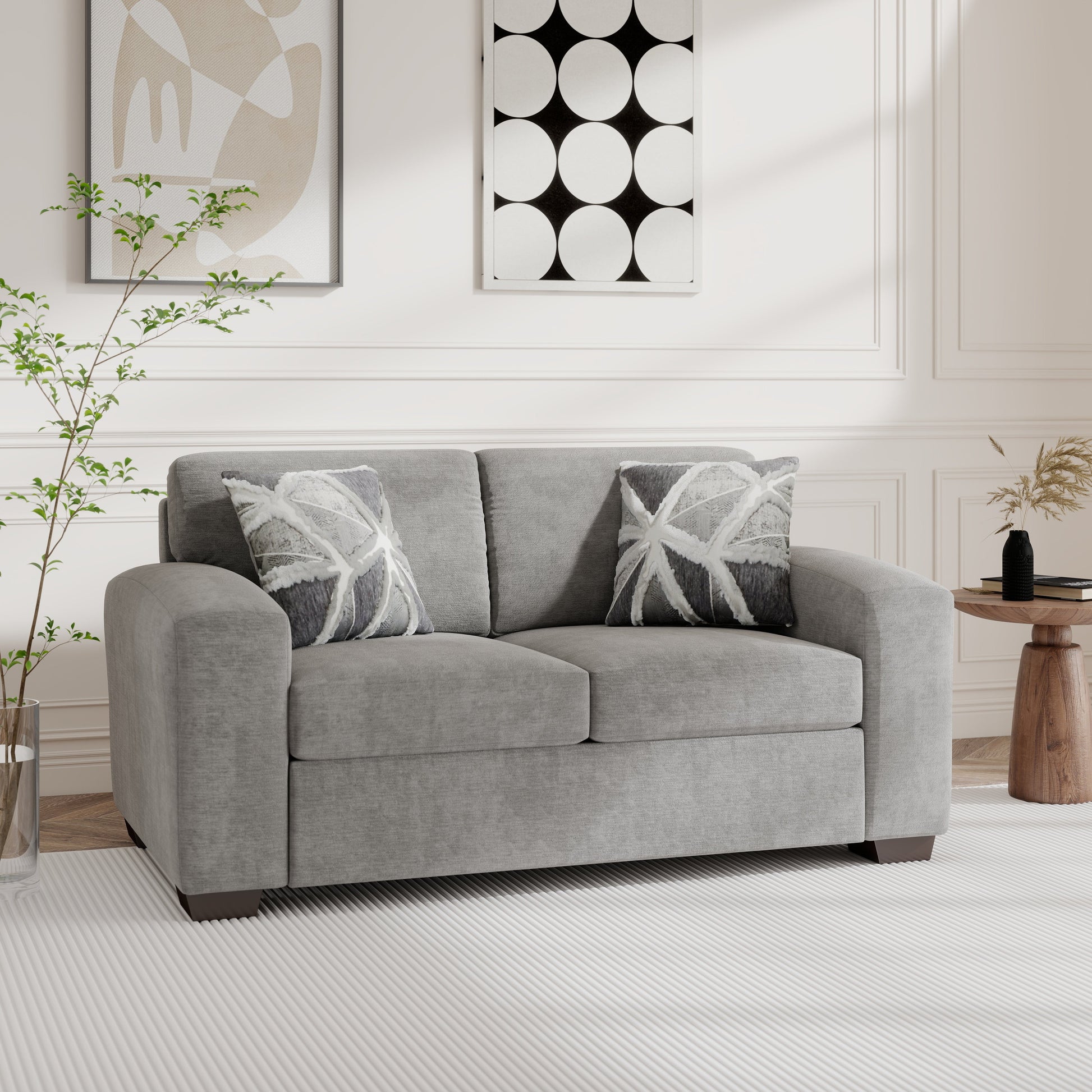 Compact in size but big on style and comfort, the Roundhill Furniture Arden Loveseat in posh gray chenille is the perfect fit for smaller living rooms, apartments, or cozy nooks. Designed for a cozy seating upgrade, it features the soft-touch chenille upholstery, durable hardwood inner frame, and a clean-lined silhouette. Included accent pillows, in plush white wide wale corduroy and bold geometric patterns, which add depth and warmth to your lovely home. Whether paired with the matching sofa or styled solo, this loveseat offers timeless comfort with a modern edge, proudly made in the U.S.
