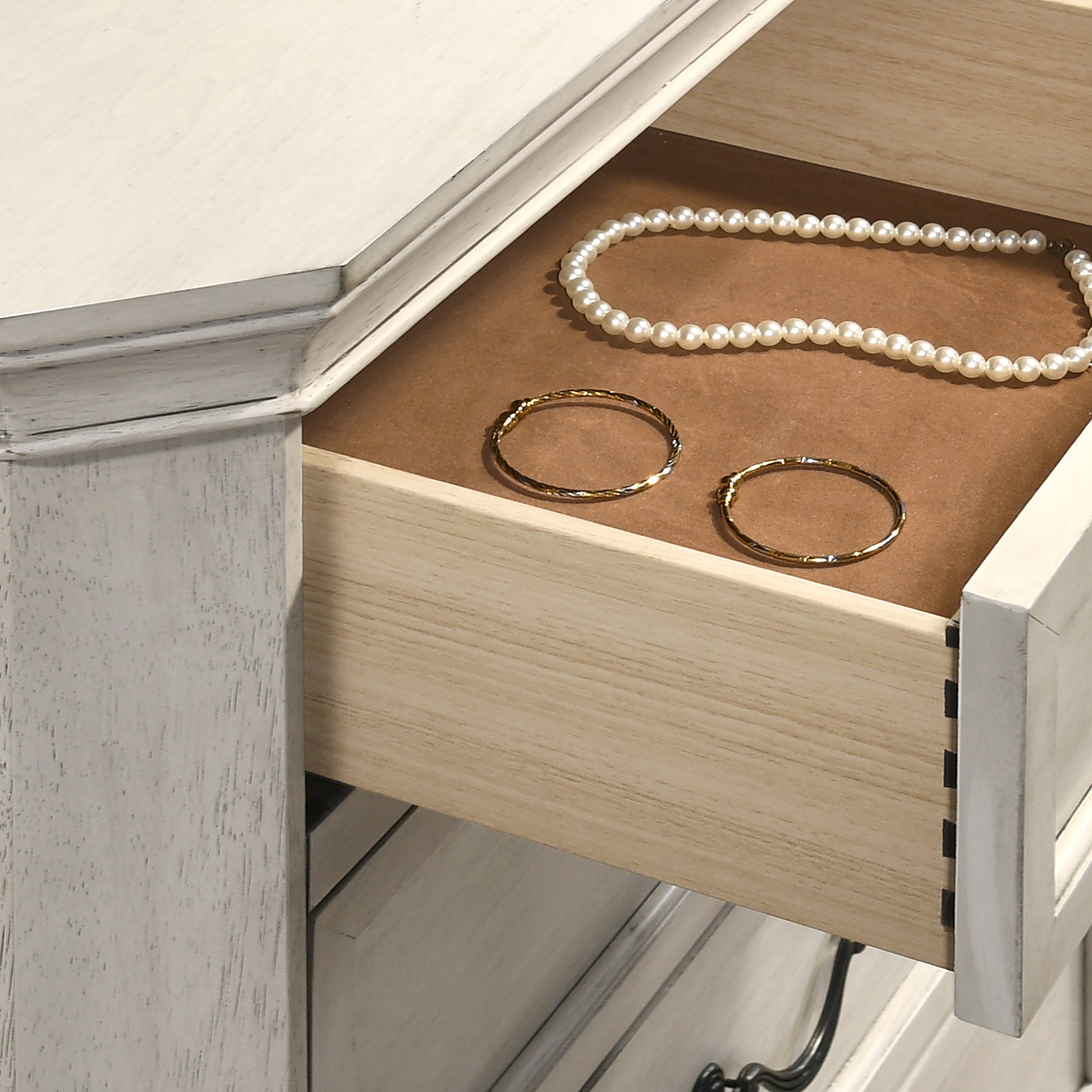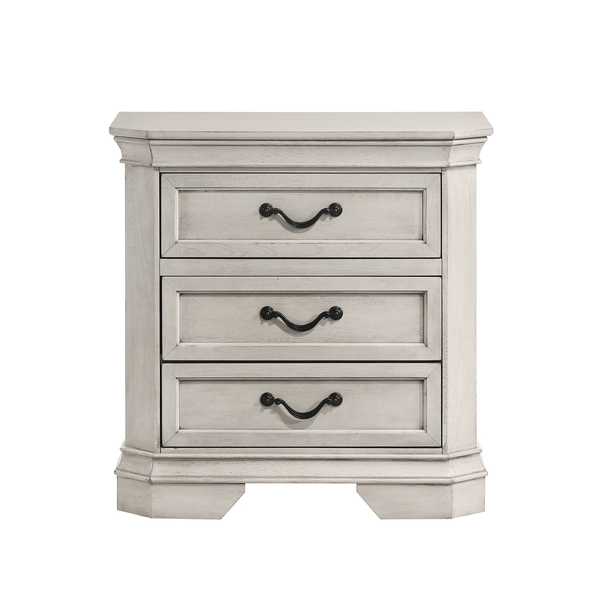 The vintage-inspired Roundhill Furniture Maderne Traditional Wood 3-Drawer Nightstand is an elegant way to add an elegant appeal to your bedroom. This nightstand is made from a sturdy solid wood frame and MDF panels. Three spacious sliding drawers give you plenty of room for your nighttime essentials. The sleek antique pewter finished metal handles add a level of elegant appeal that elevates any bedroom. Details like the visible wood grain and short blocked legs finish the look. Fully assembled.