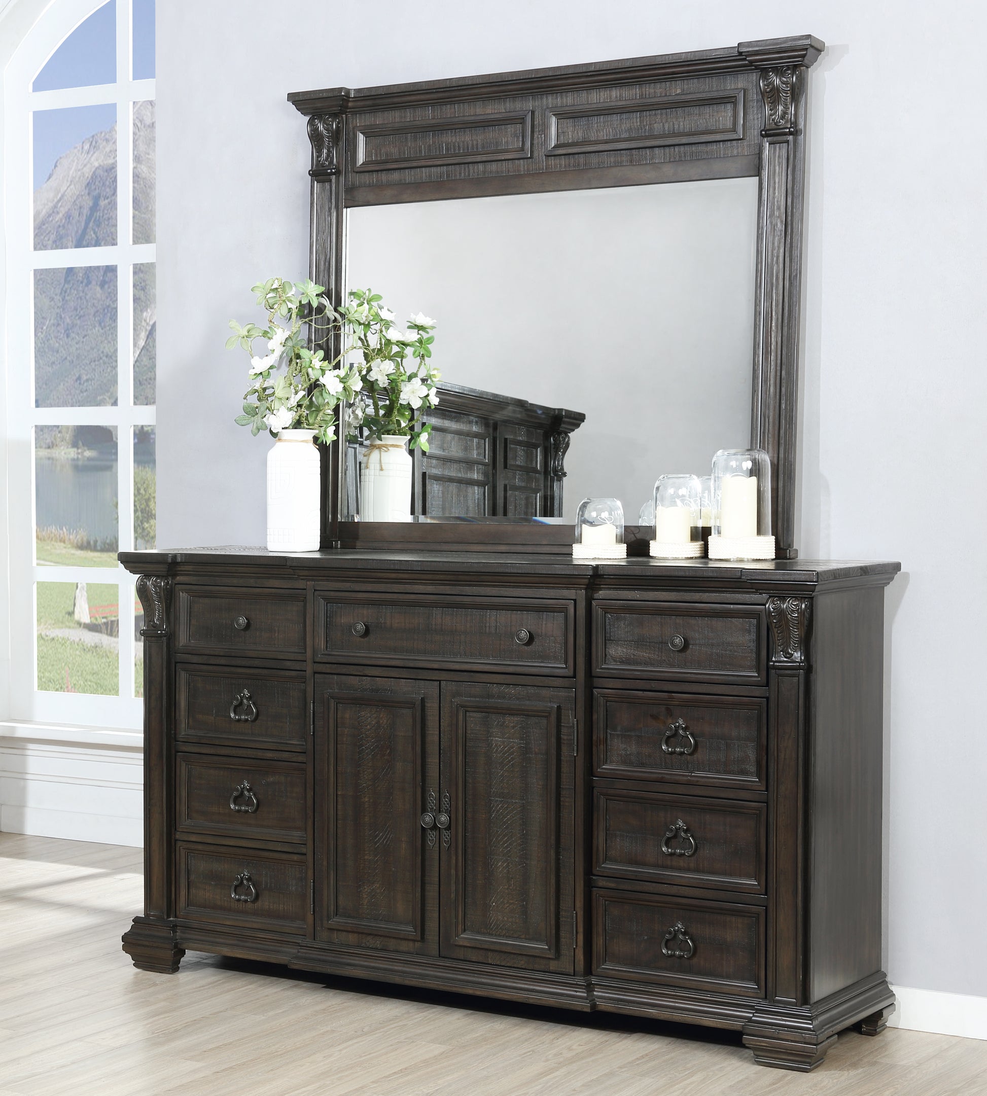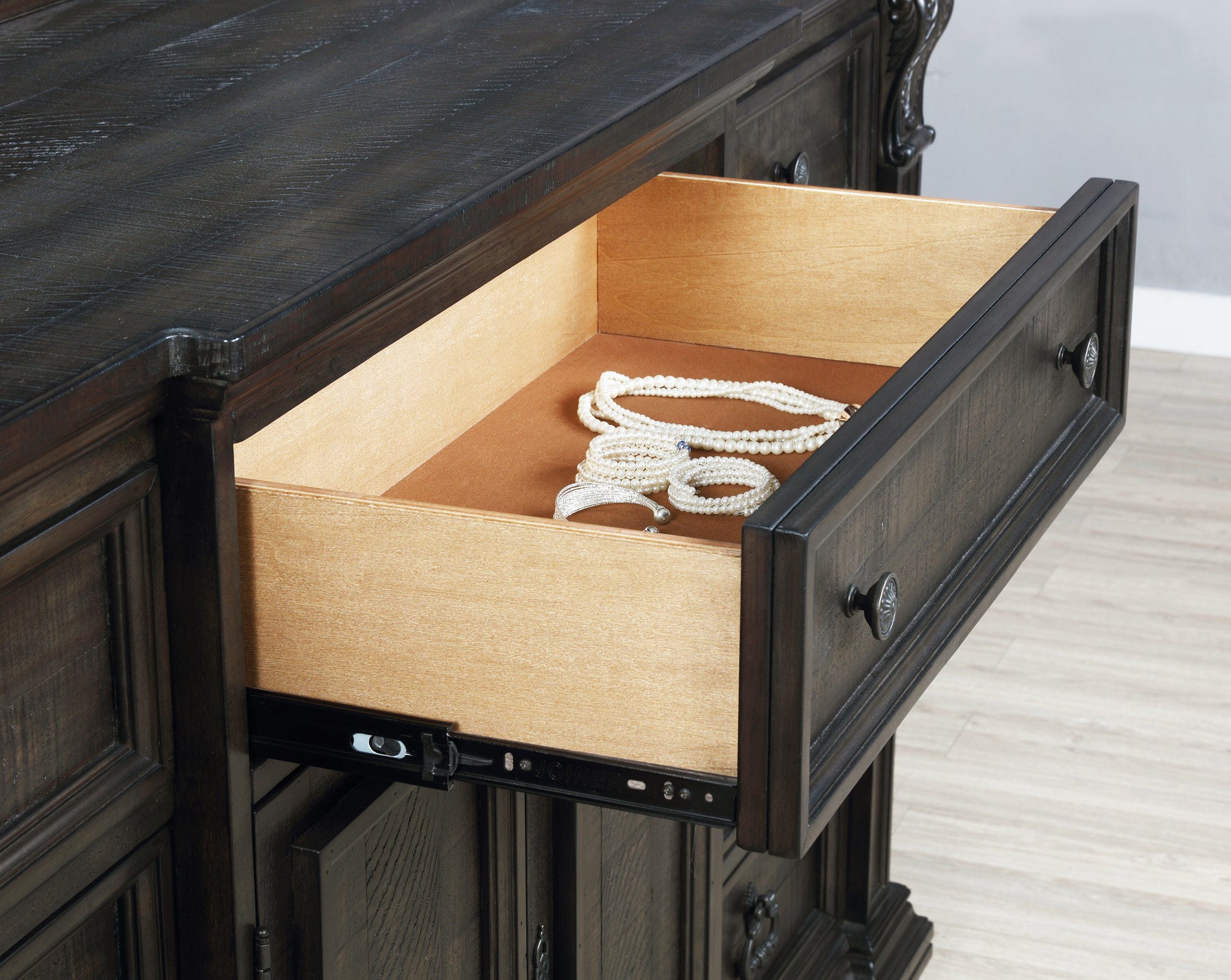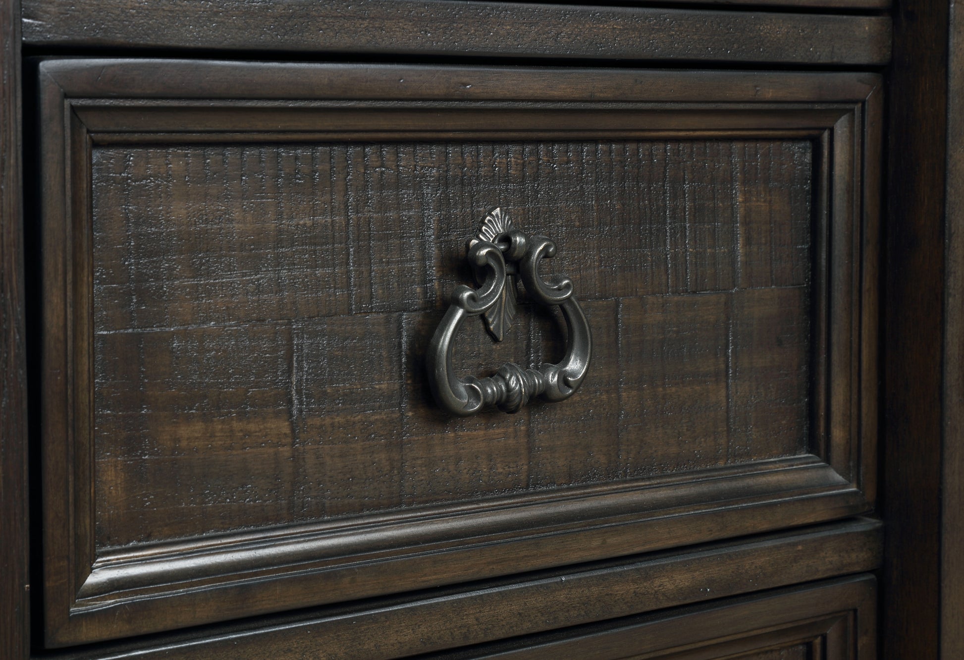The Farson Distressed Dark Walnut Wood Dresser with Door offers abundant storage space and rustic style for your bedroom. This dresser is durably constructed of engineered wood, solid pine wood, and acacia veneers. It's covered in a rich, distressed dark walnut finish. The nine drawer fronts feature framed edges and vintage-feel metal nobs and bail pull handles. Each drawer opens and closes smoothly on ball bearing glides. The top drawers feature fabric felt to protect your delicate items.