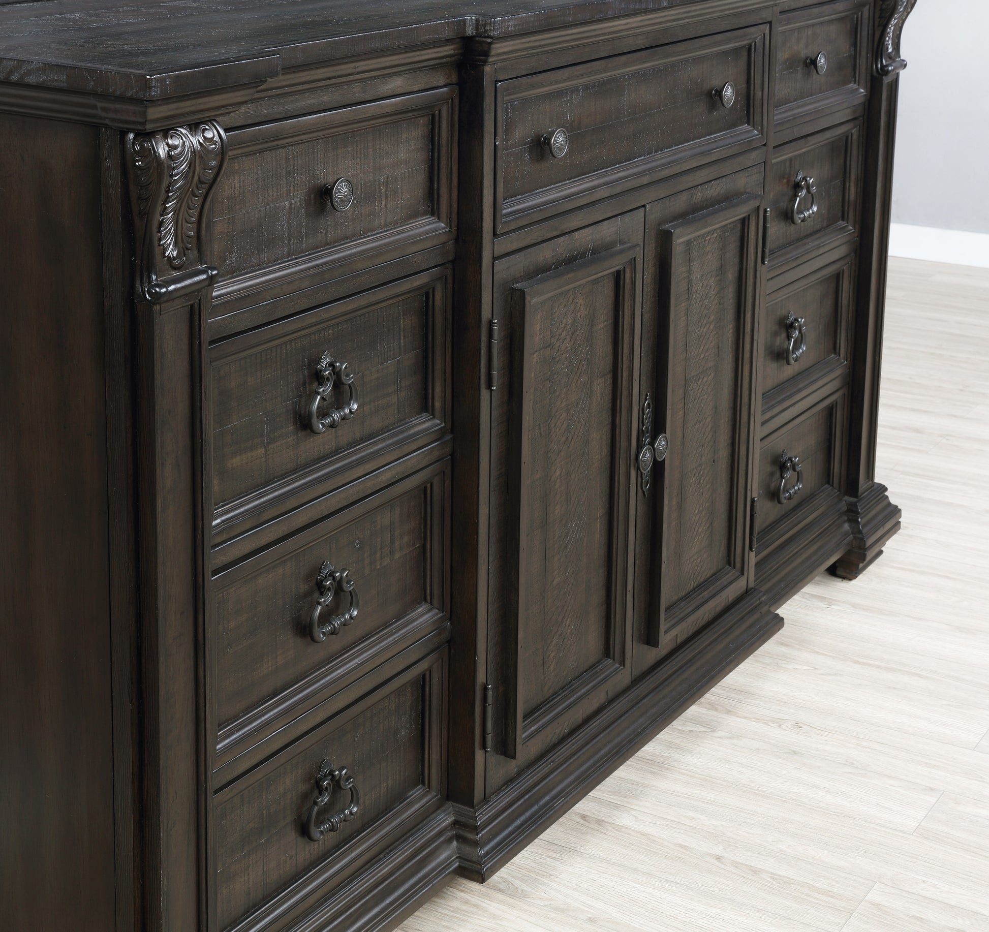 - The dresser features 9 drawers and a spacious cabinet with two shelves. The drawer front is French dovetail construction, the drawer back is English dovetail construction. Each drawer opens and closes smoothly on ball-bearing glides