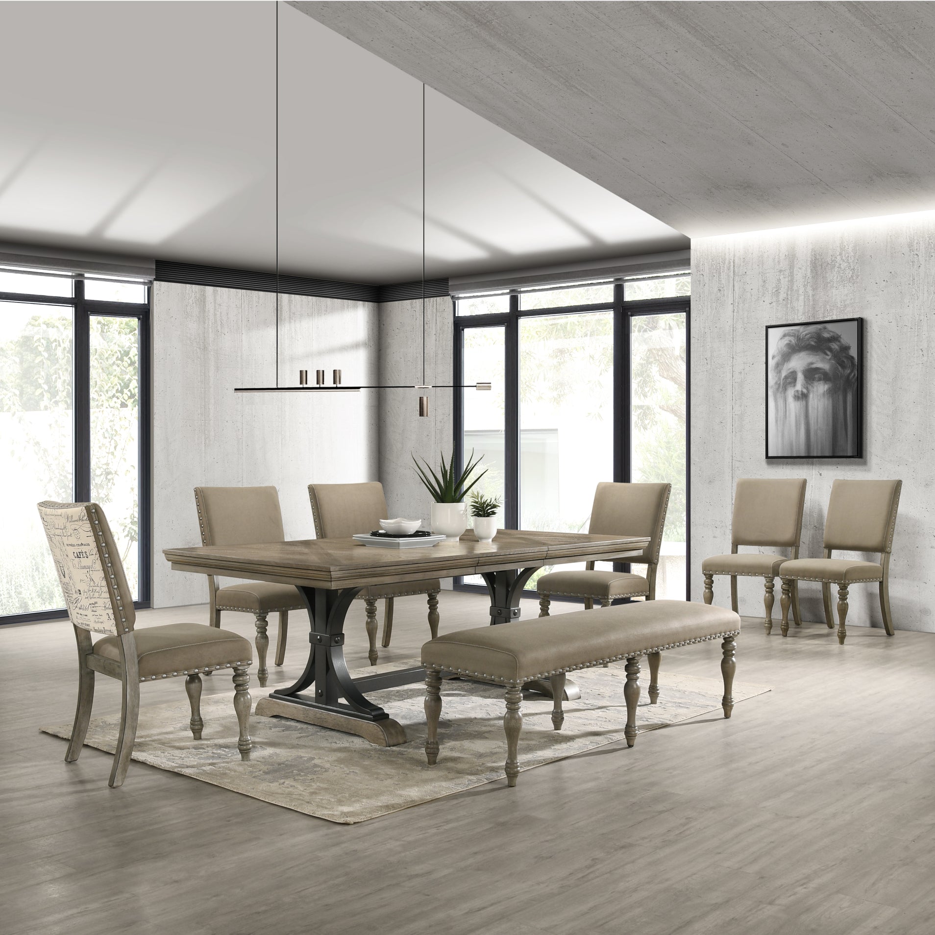 - Complete Dining Set – Includes one driftwood-finished dining table, six matching side chairs, and a bench.