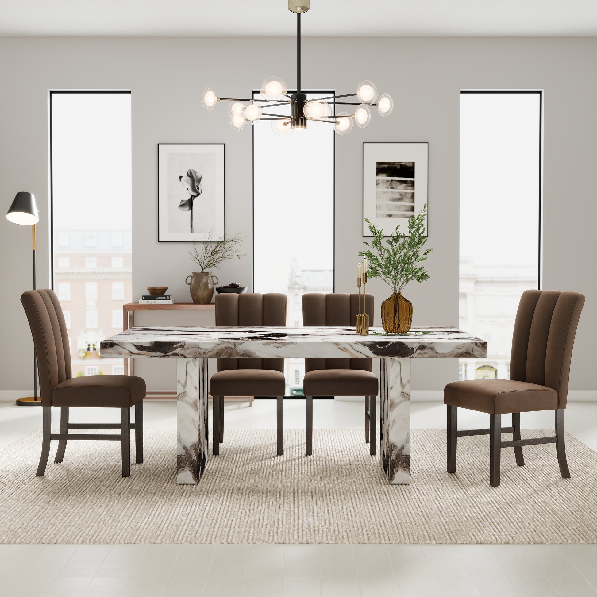 Create an elegant dining space with the Cavira 5-Piece Modern Faux Marble Dining Set from Roundhill Furniture. This stunning set includes a dining table and four matching chairs that blend luxury and practicality. The table’s off-white faux-marble top showcases natural-looking veining in black, gray, and a hint of warm brown, while its double pedestal base enhances the sculptural, high-end aesthetic. Each chair features soft chocolate-colored polyester upholstery, gently curved backs, and cushioned seats for lasting comfort. Designed to impress yet easy to maintain, Cavira transforms everyday dining into a refined experience.