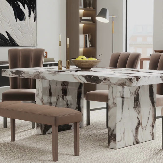 - Luxurious Faux Marble Design: Off-white tabletop with natural-looking brown veining creates a refined, modern focal point for any dining space. Double pedestal base enhances visual balance and architectural appeal.