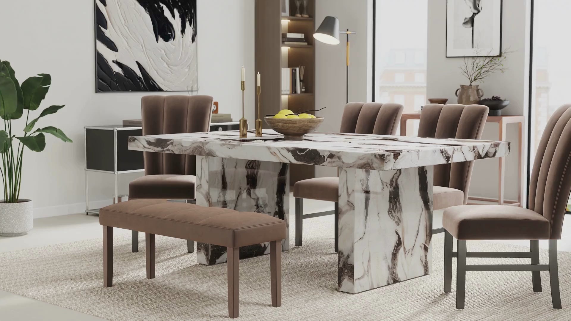 Create an elegant dining space with the Cavira 6-Piece Modern Faux Marble Dining Set from Roundhill Furniture. This stunning set includes a dining table, four matching chairs, and a bench that blend luxury and practicality. The table's off-white faux-marble top showcases natural-looking veining in black, gray, and a hint of warm brown, while its double pedestal base enhances the sculptural, high-end aesthetic. Each chair features soft chocolate-colored polyester upholstery, gently curved backs, and cushioned seats for lasting comfort. Designed to impress yet easy to maintain, Cavira transforms everyday dining into a refined experience.