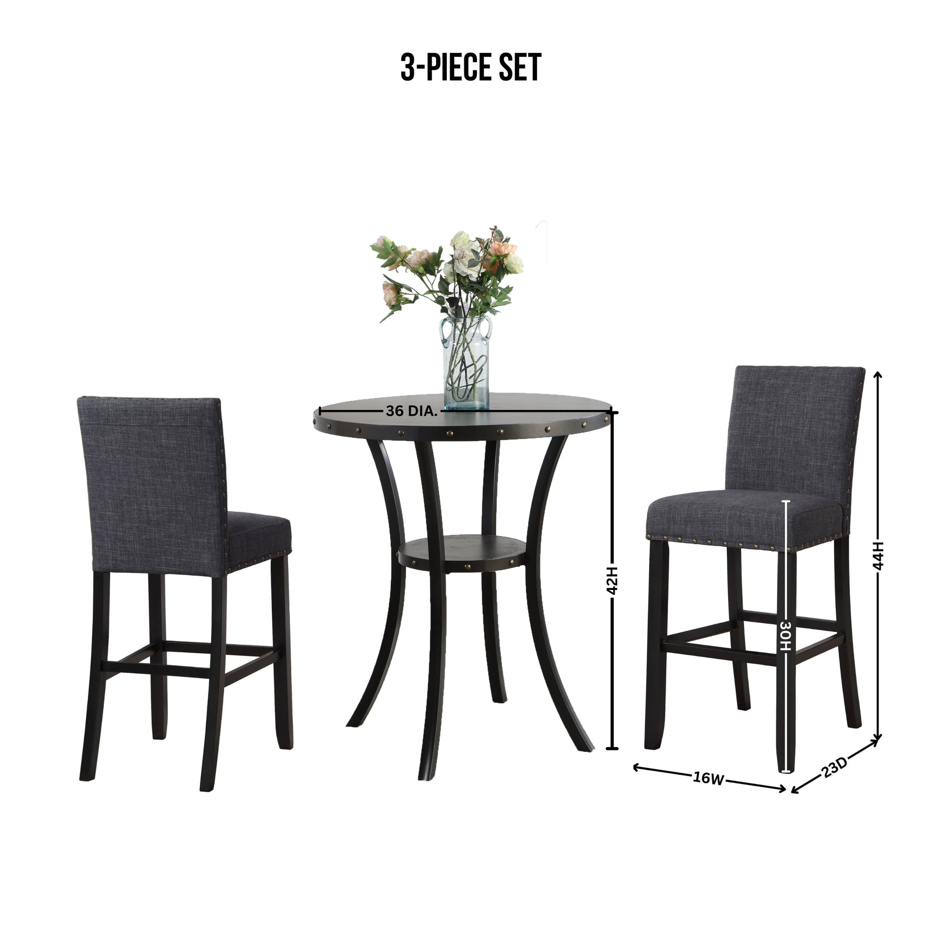 Biony 3-Piece 36" Round Espresso Finish Bar Table with 2 Gray Fabric Nail Head Pub Chairs