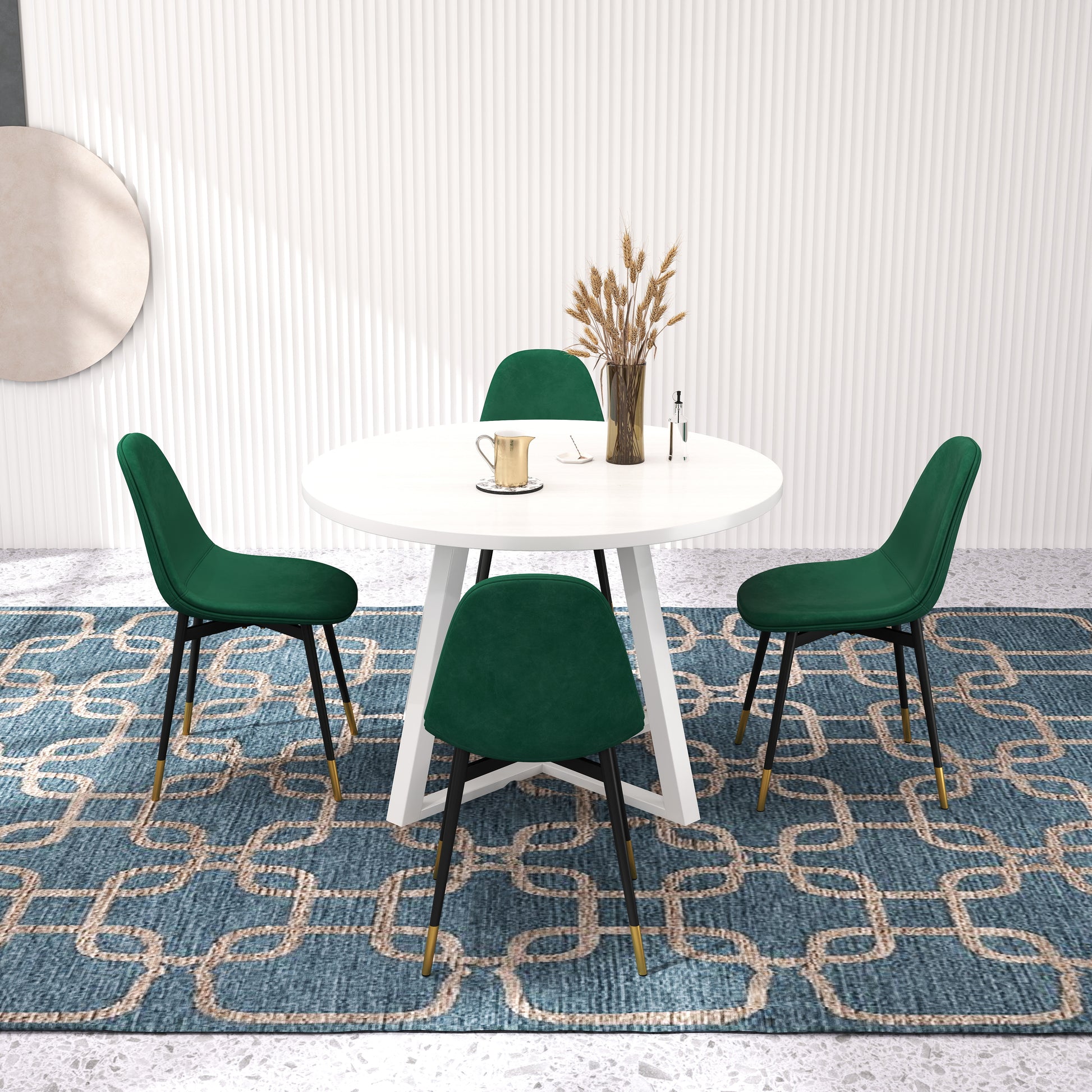The dining table features clean lines with a minimalist design. Its white stylized trestle base adds a touch of elegance, while the melamine tabletop ensures durability and minimalist appeal. Constructed with a rubberwood base and decorative MDF laminate top, this round table provides ample space for entertaining family and friends. The chairs, which are upholstered in plush polyester velvet, offer an extra level of comfort with their polyester blend fabric. The gold-tone metal legs not only provide long-lasting support but also add a touch of style, and this design provides a snug fit that conforms to your curves.