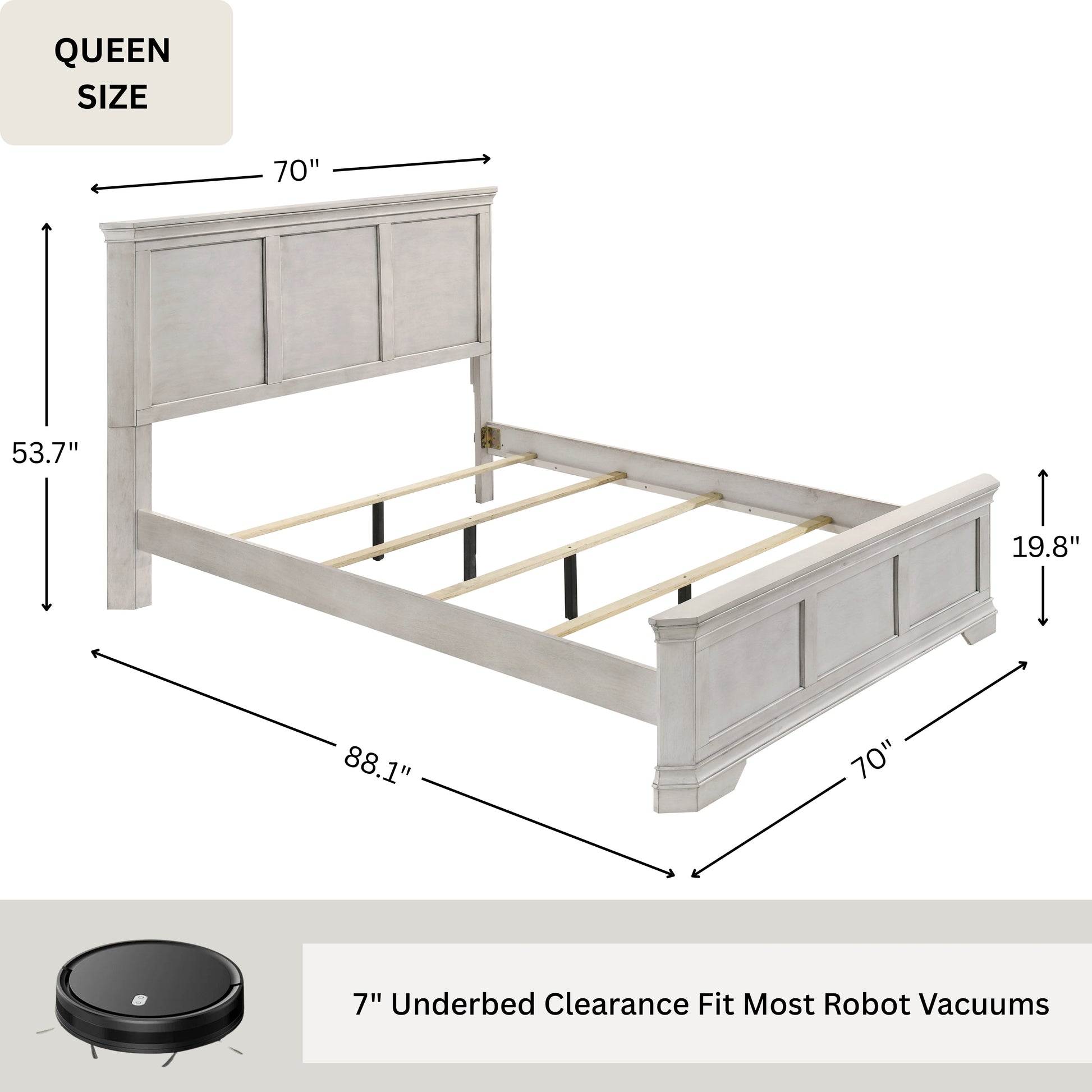 Queen bed overall dimension: 70"W x 88.1"D x 53.7"H. Headboard: 70"W x 3.5"D x 53.7"H, footboard: 65.16"W x 3.5"D x 19.8"H, rail: 81.1"W x 0.7"D x 5.5"H.