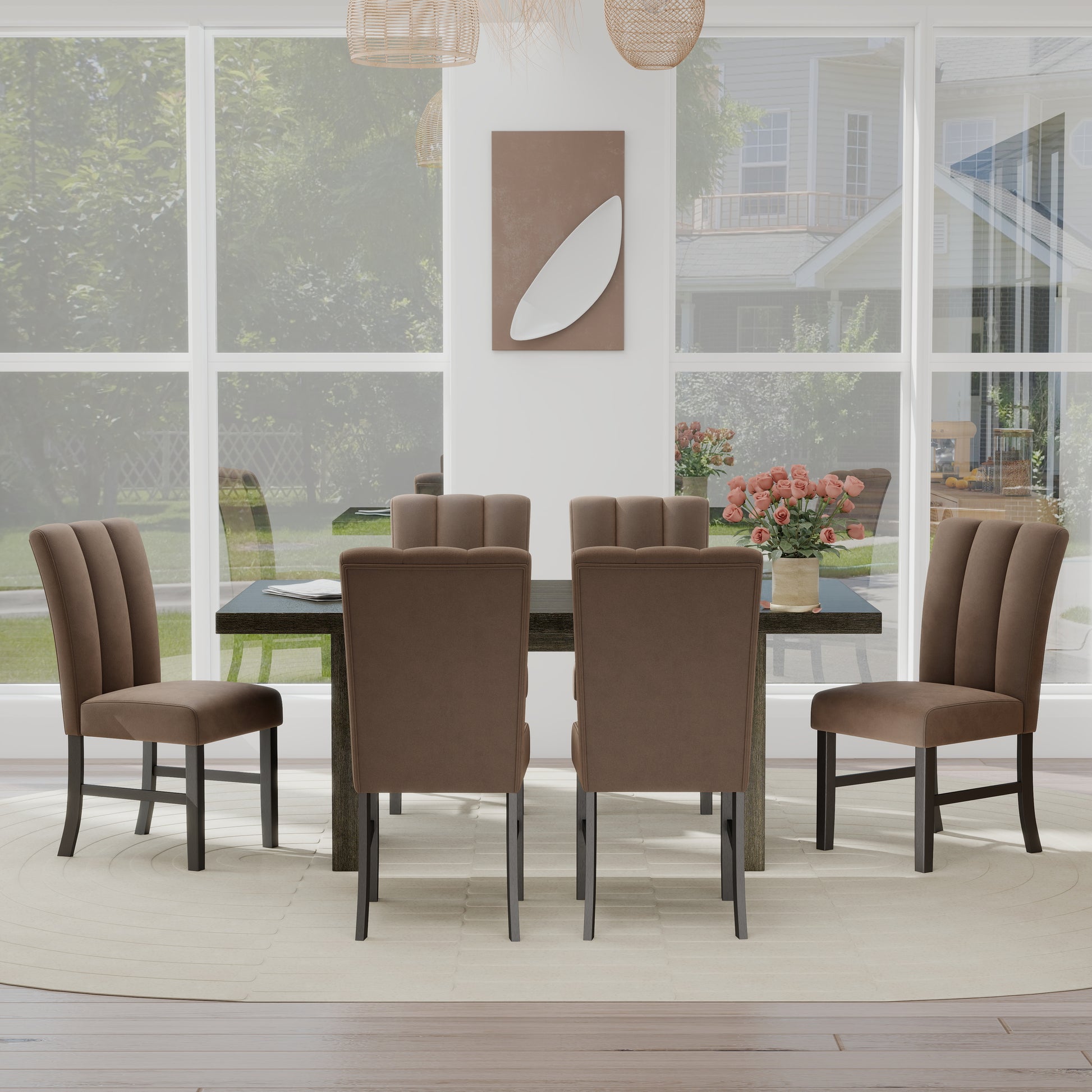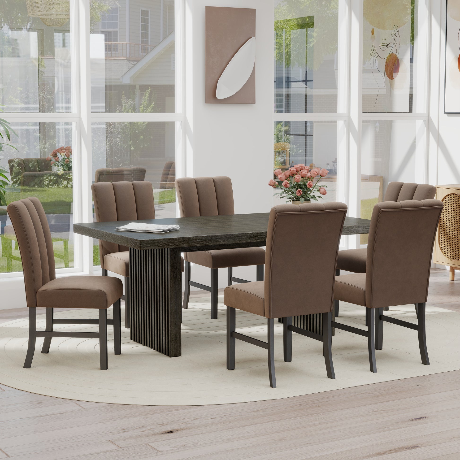 Redefine your dining space with the Roundhill Furniture Madison 7-Piece Dining Set, where modern design meets timeless warmth. The rectangular dining table features a rich espresso finish and a sculptural slat-fluted base that adds visual intrigue to any room. Crafted from durable MDF with oak veneer, it showcases natural wood grain details that bring texture and depth. Six chocolate polyester-upholstered chairs complement the table beautifully with soft channel tufting and plush cushioning, creating a space that feels both inviting and refined.