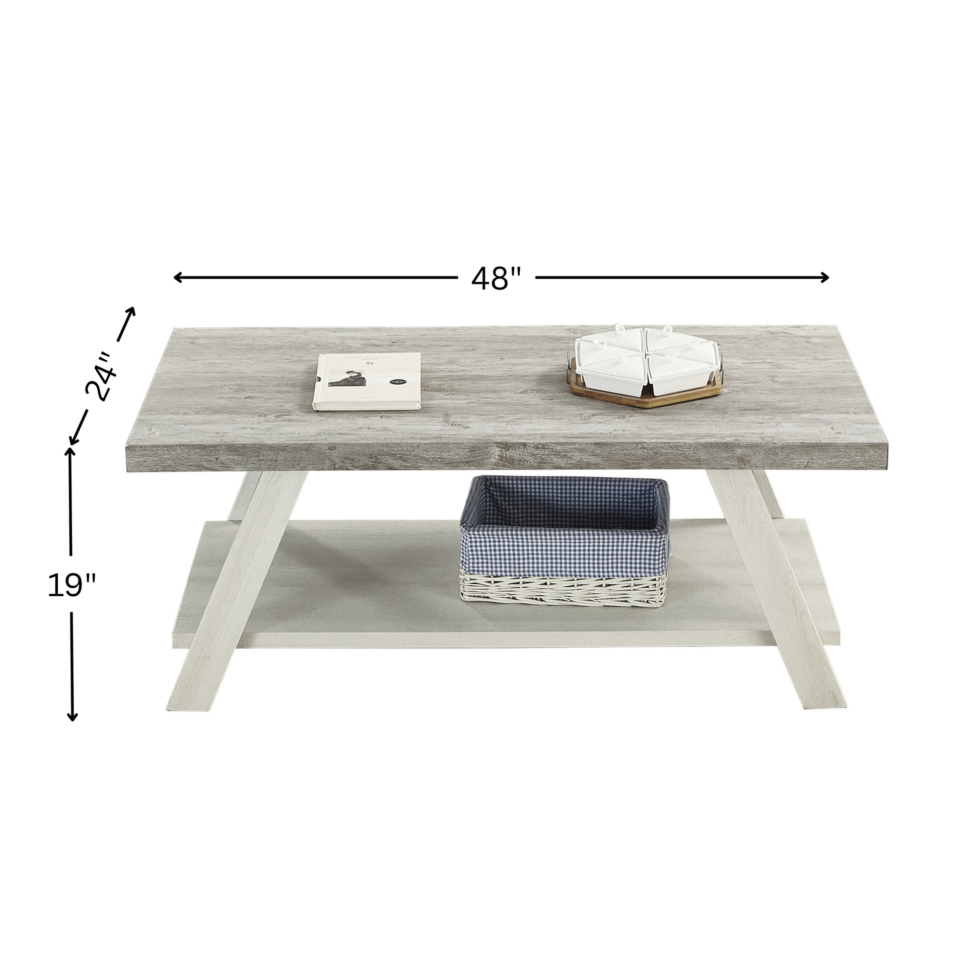 - Coffee table with a weathered gray finish on table top and beige finish on the base