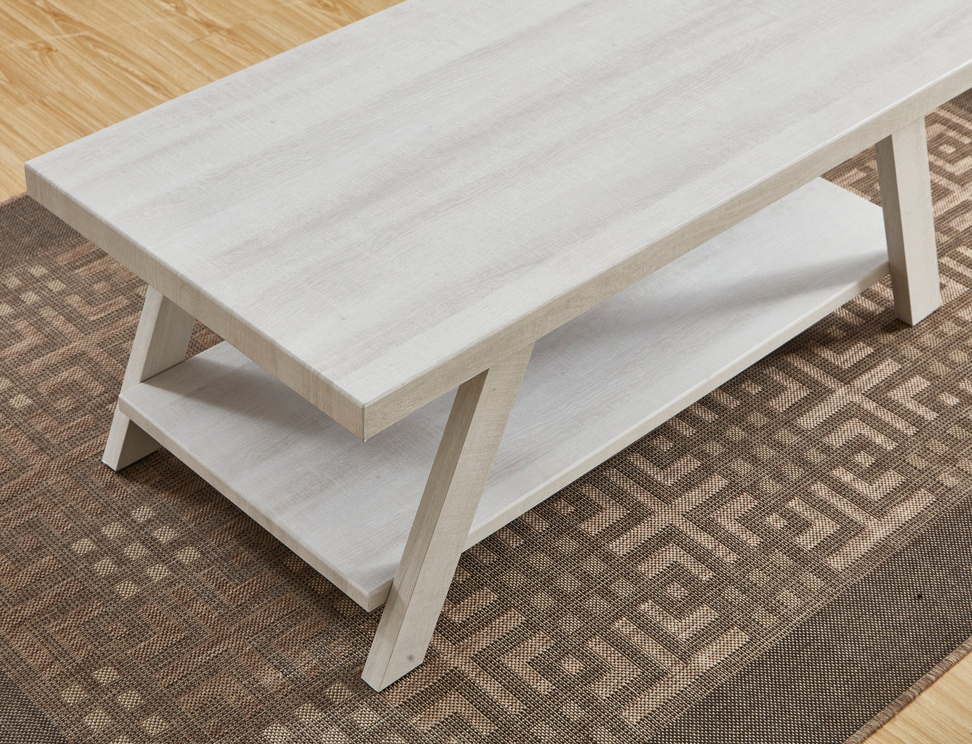 The Athens Contemporary Wood Shelf Coffee Table Set provides your room with a lodge-style feel that's at once stunning and welcoming. The compact frame of this coffee table is built from fine hardwood solids with wide-angled legs in a white finish. Inspired by sawhorses and the simplicity of some craftsman-era tables, this coffee table set fits with rustic or contemporary styles.