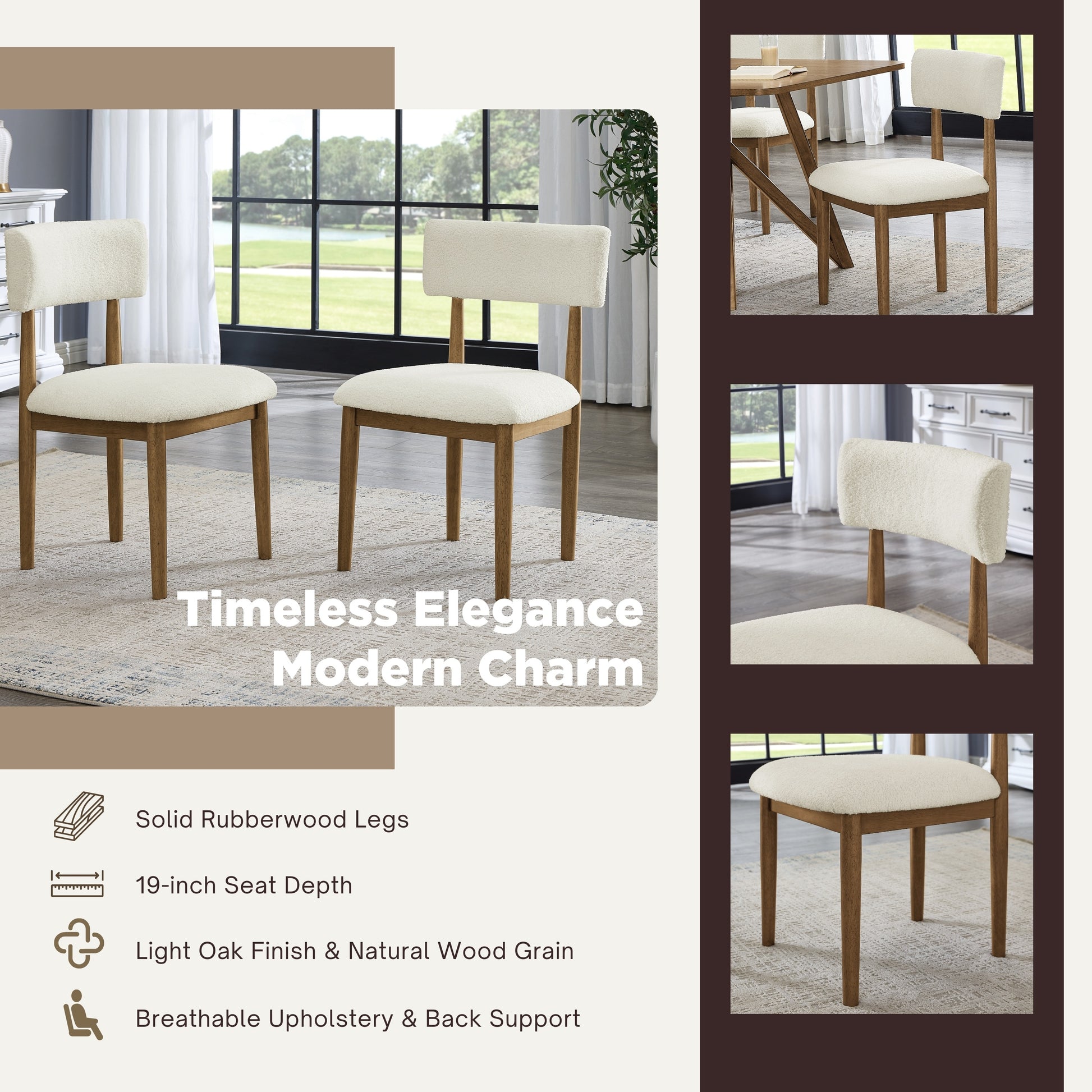 - [COZY UPHOLSTERY CHAIRS]: Dining chairs feature a curved design that blends perfectly with your back. The solid rubberwood frame is finished in light oak for superior stability. Seat and backrest are meticulously upholstered in premium fabric. Its clean lines and elegant silhouette create the ideal effect of modern aesthetics.