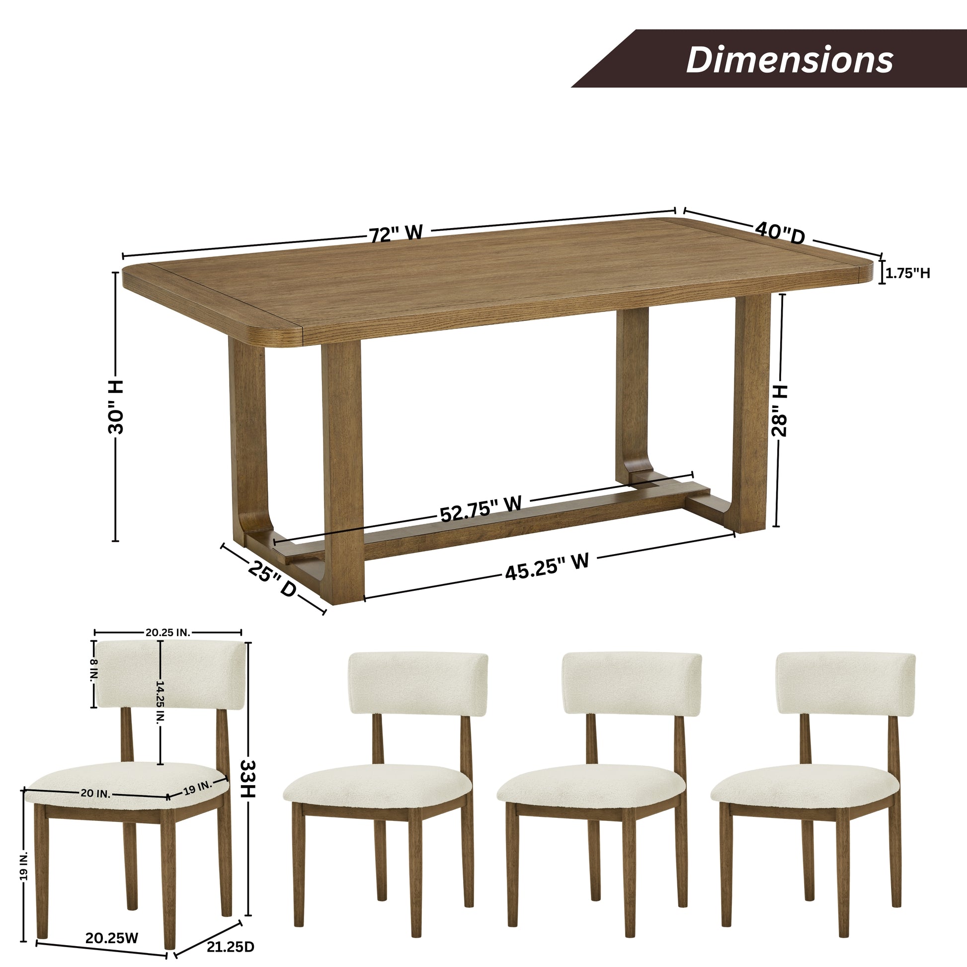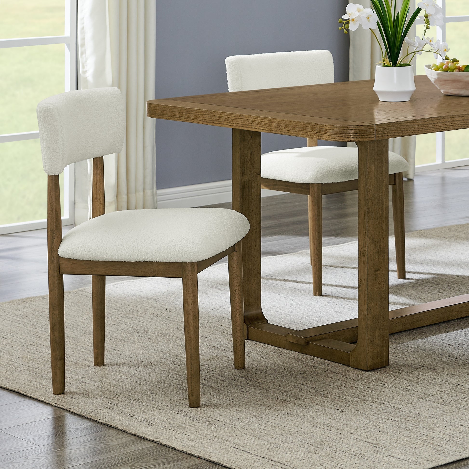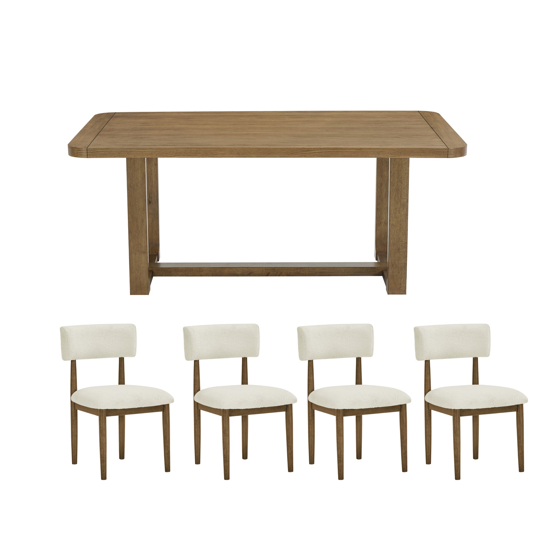 This dining set embodies modern sophistication, enhancing your dining space with its elegant design. Featuring a beautiful wood grain texture, the set is sure to impress your guests. The dining table boasts a trestle base crafted from durable rubberwood, paired with an oak veneer top for lasting resilience. The accompanying chairs seamlessly complement the table’s aesthetic. Crafted from solid rubberwood frames, they deliver reliable support and enduring comfort. Each chair is adorned with beige upholstery, merging elegance with cozy practicality. Discover the Andus collection, where timeless design meets everyday durability.