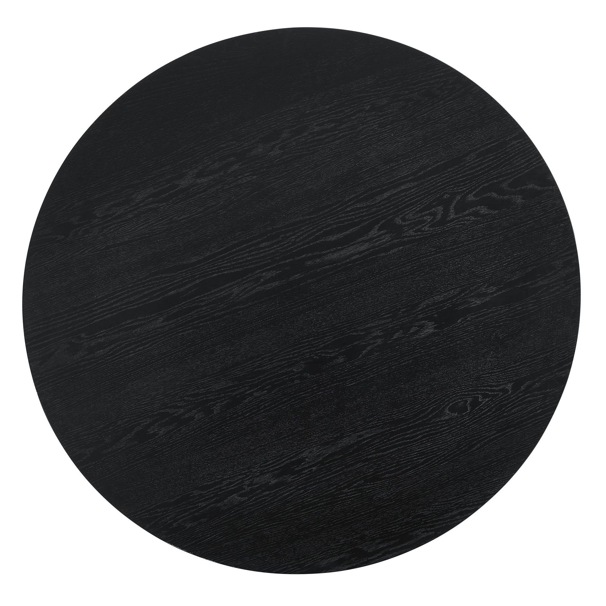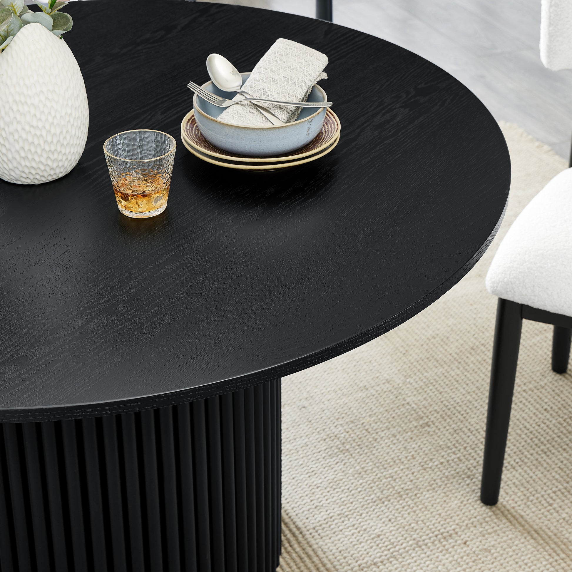 - ➤ [FLUTED PEDESTAL DINING TABLE]: The table has a round shape that creates an intimate atmosphere, while the slatted base adds both stability and style as well. The table top is made from durable MDF and oak veneer, with the base made from rubberwood. Finished in black with a natural wood grain texture, the table exudes elegance.