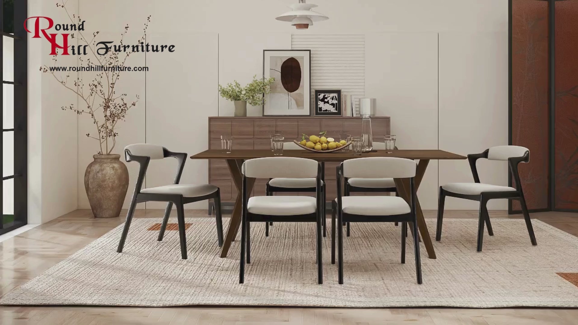 Refresh your dining space with the modern sophistication of the Roundhill Furniture Lavin Dining Set, featuring a walnut-finished rectangular table and four contemporary dining chairs. The table is crafted with a solid rubberwood base and an MDF top with Okume veneer, offering both durability and sleek design. The chairs showcase a gently curved backrest, solid rubberwood frames in a striking black finish, and soft upholstered seats for everyday comfort. Perfect for both casual and formal meals, this set brings bold contrast and refined style to any interior.