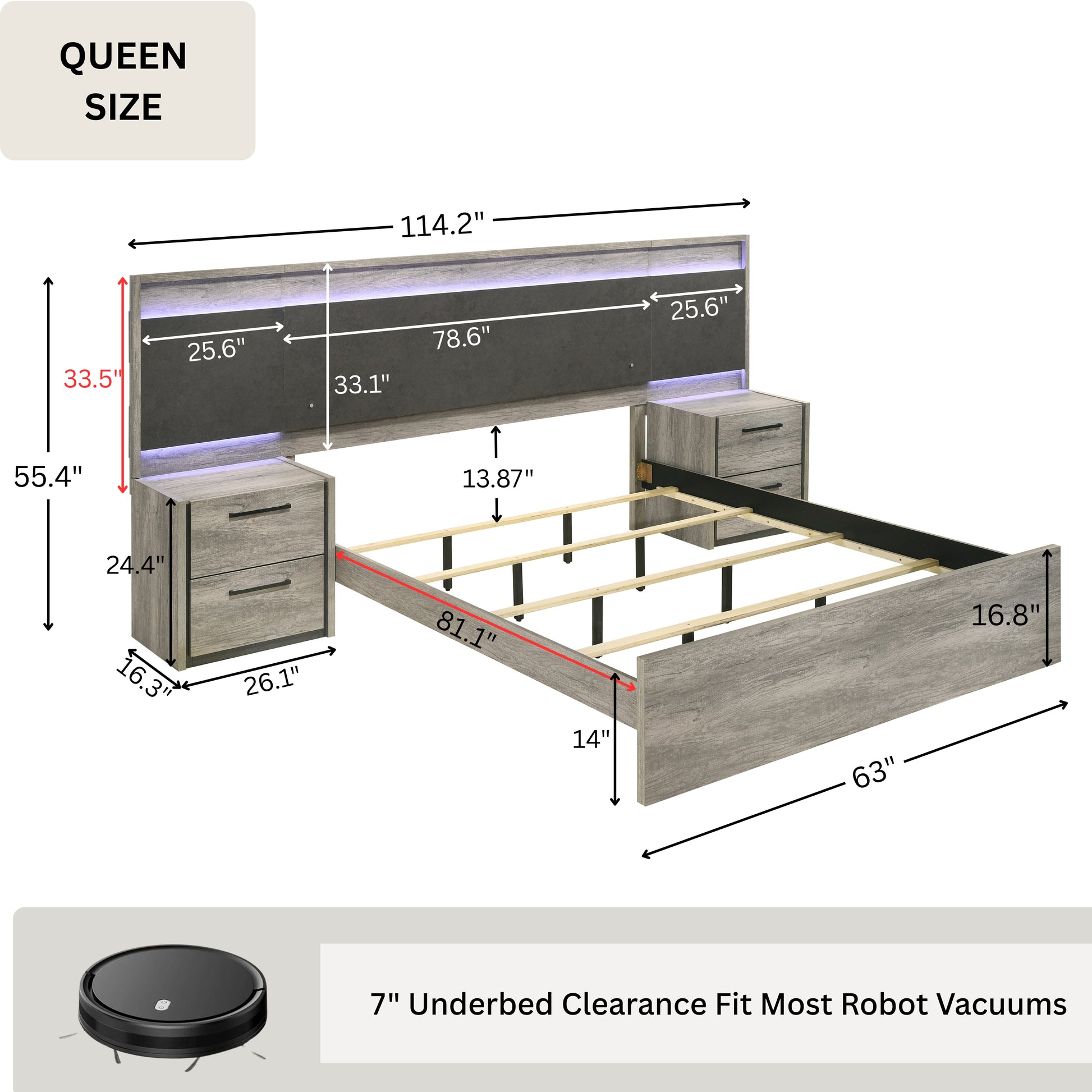 Queen bed overall dimension: 114.2"W x 84.1"D x 55.4"H. Queen Headboard: 63"W x 1.9"Dx 55.4"H. Footboard: 63"W x 1.8"D x 16.8"H. Rail: 81.1"W x 5.51"D x 0.7"H. Wall pier: 25.6"W x 1.8"D x 33.5"H.