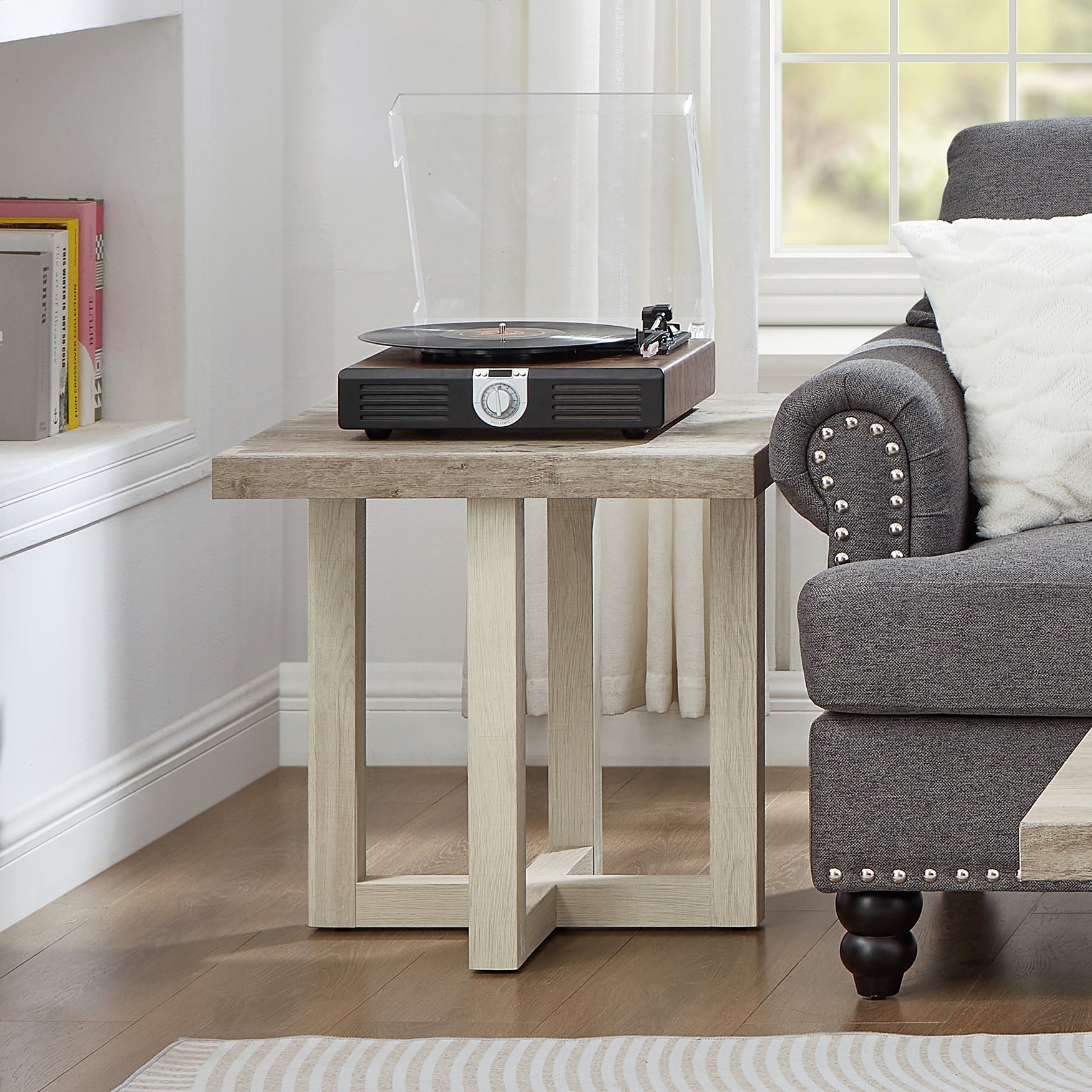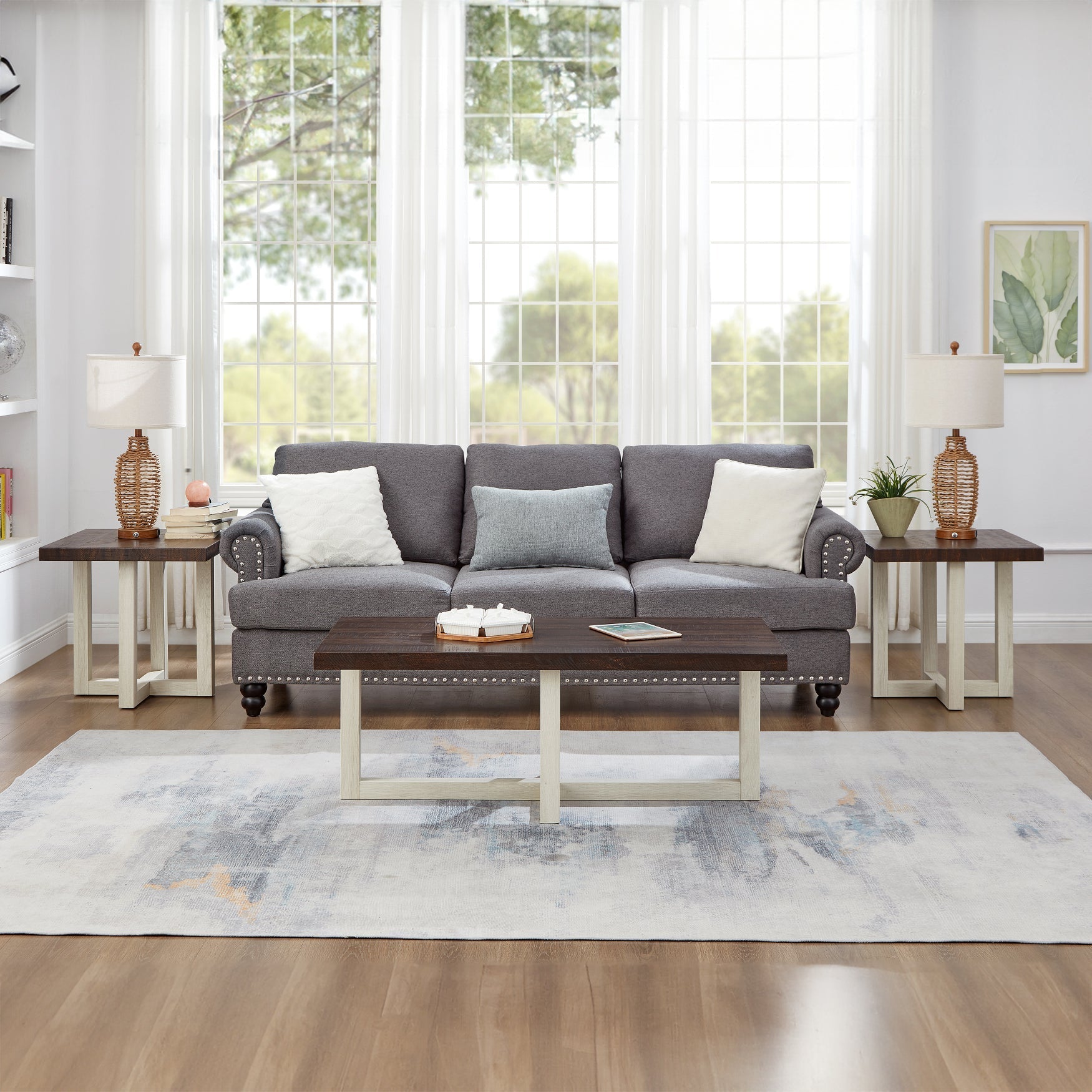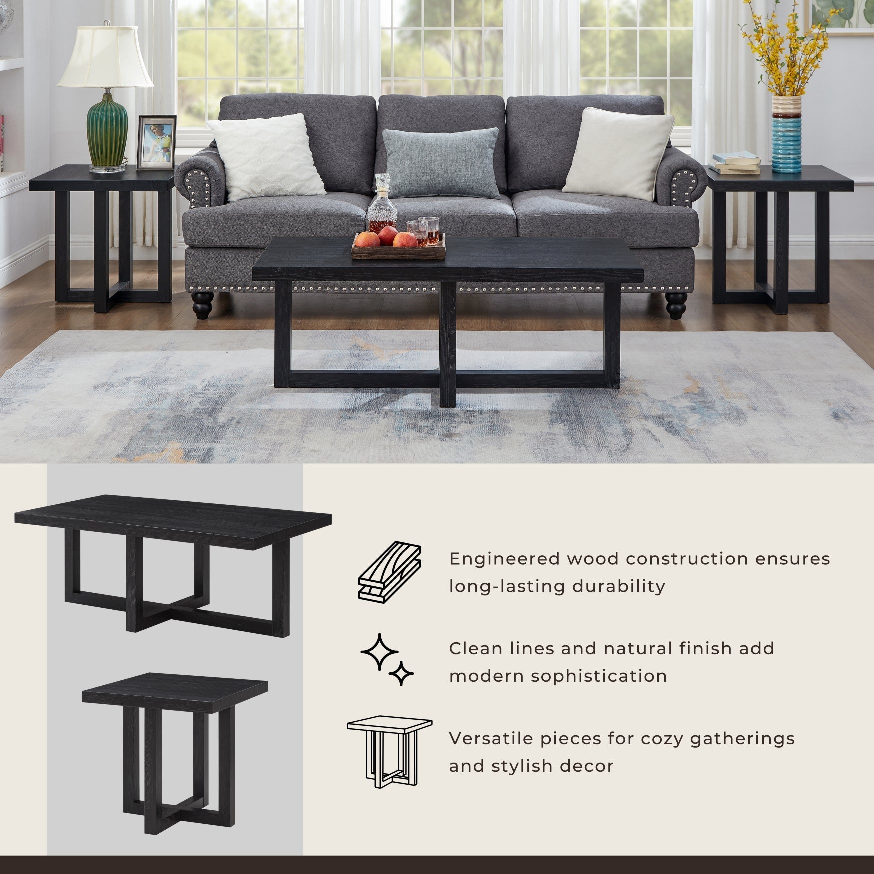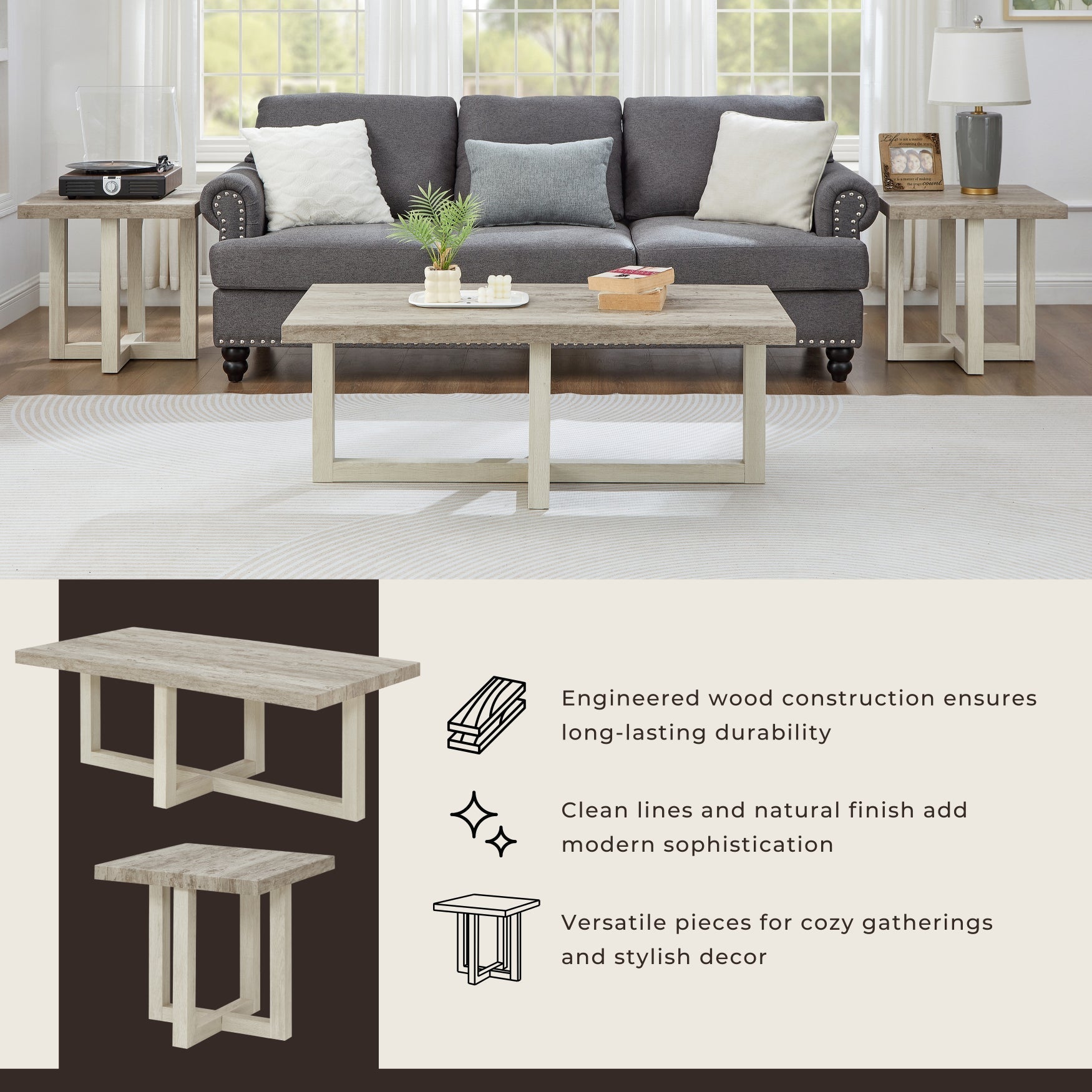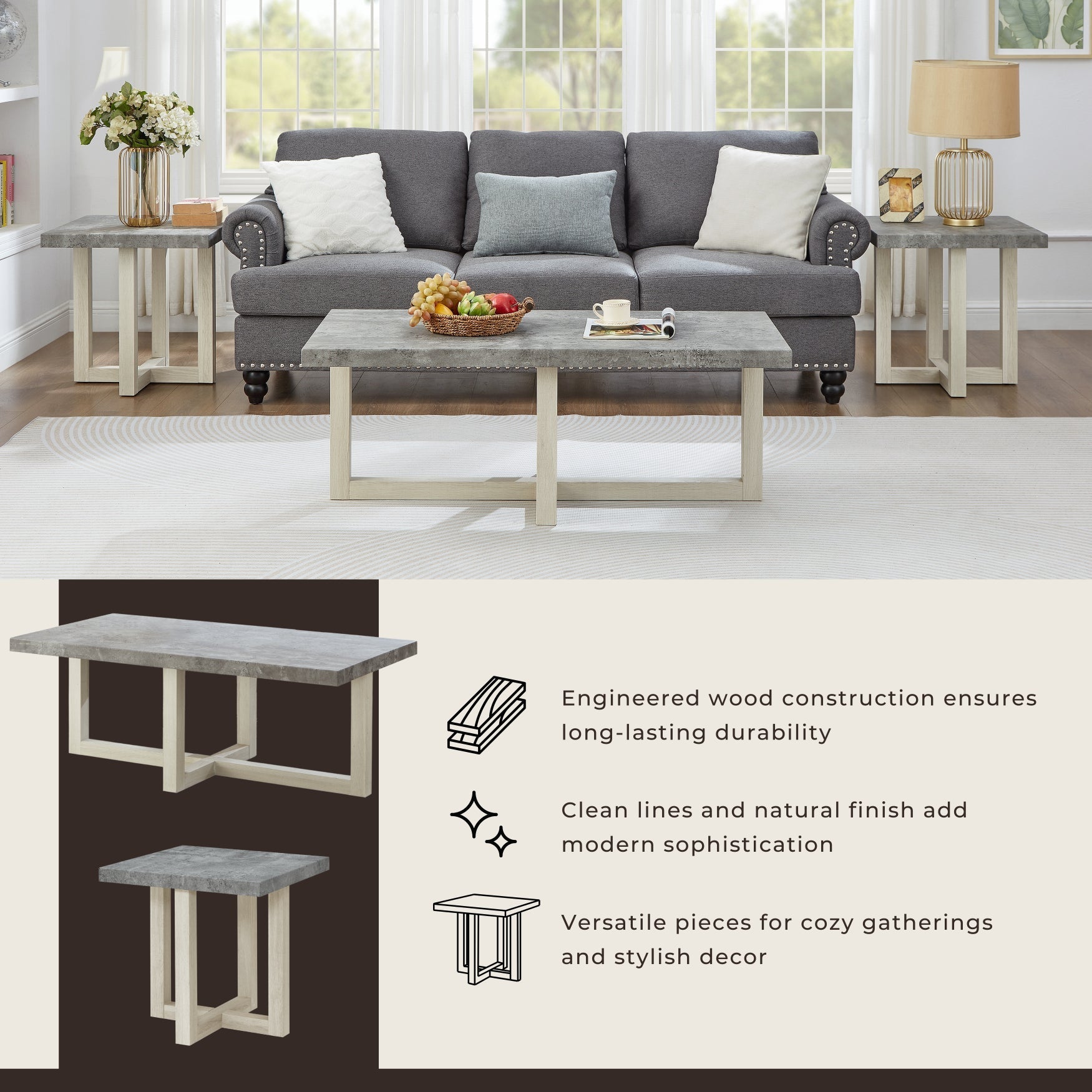 Sleek, structured, and effortlessly modern?€?this 3-piece coffee table set is a perfect foundation for contemporary living. Featuring one coffee table and two matching end tables, this coordinated trio is designed to bring balance and style to your space. The minimalist silhouettes are grounded by bold, intersecting bases that lend architectural interest, while the richly textured finishes?€?available in Weathered Gray and Beige, Black, Faux Concrete and White, or Walnut & White?€?add warmth and depth. Whether you're curating a cozy corner or completing a full living room look, this set offers a clean, cohesive aesthetic with enduring functionality.