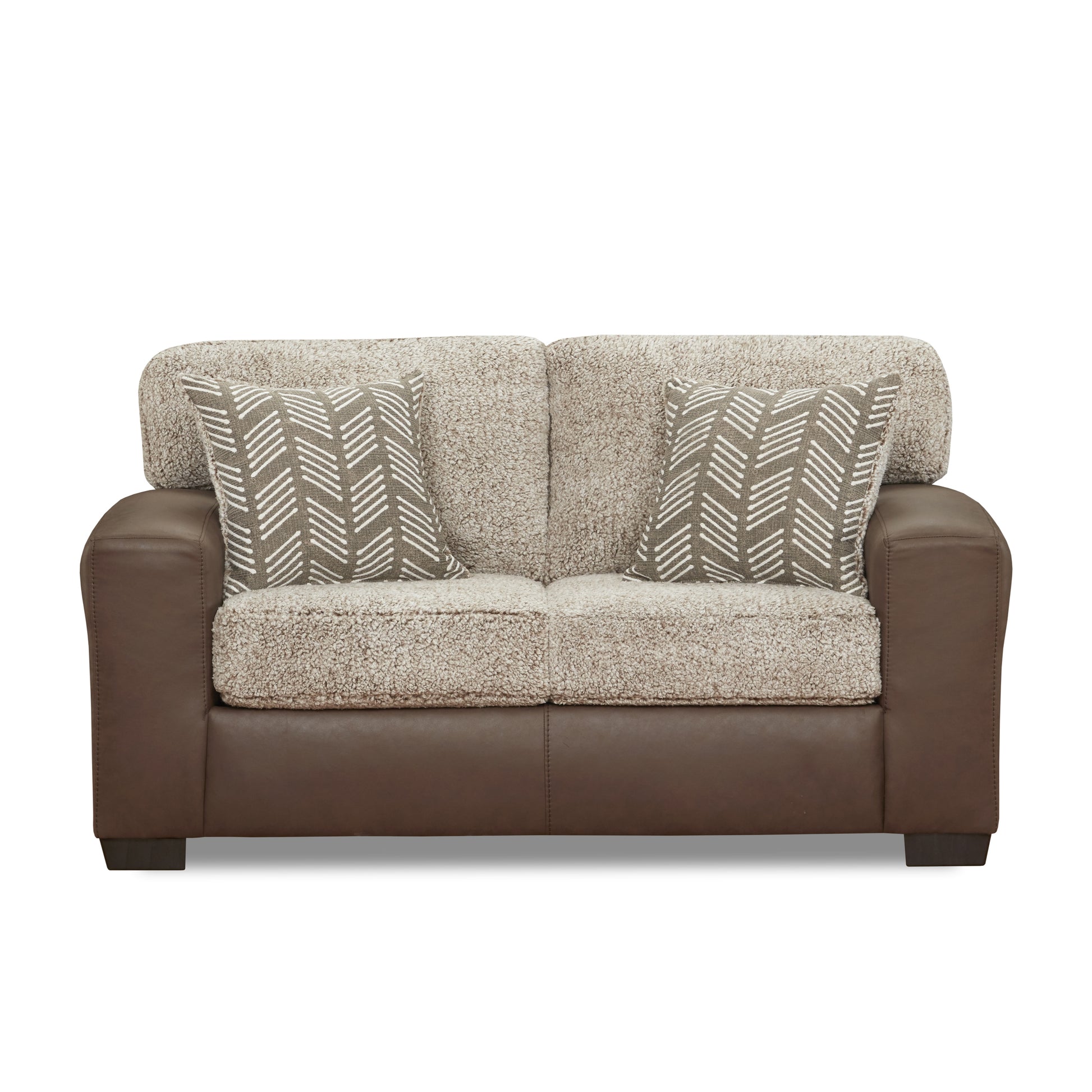 Warm, inviting, and thoughtfully styled, the Roundhill Furniture Marvella Curly Shearling Loveseat brings texture-rich comfort to your living space. Upholstered with soft light brown sherpa on the seat and back cushions and contrasted by chocolate-colored faux leather on the frame, this loveseat delivers both high-end appeal and everyday coziness. Accented with plush throw pillows in a herringbone-inspired pattern and matching sherpa fabric, it offers layered warmth and designer detail in a compact footprint. Whether styled alone or with its matching pieces, it’s a charming addition to any room.