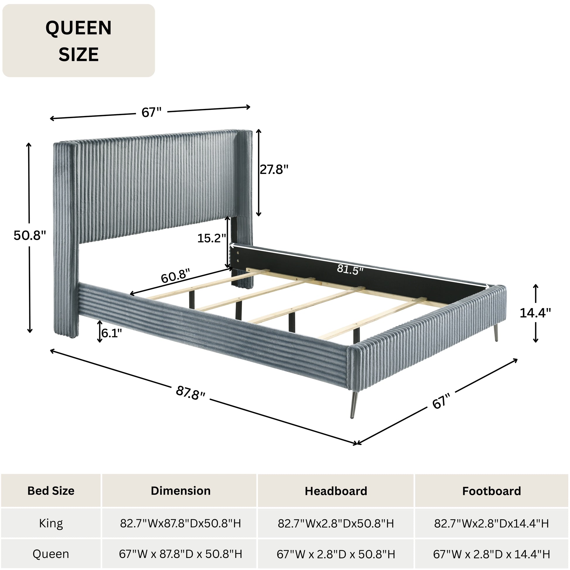 Overall Queen Bed dimension: 67"W x 87.8"D x 50.8"H. Headboard: 67"W x 3.5"D x 50.8"H. Footboard: 67"W x 2.8"D x 14.4"H. Rail: 85"W x 1"D x 8.3"H. Floor to bottom of the rails: 6.1".