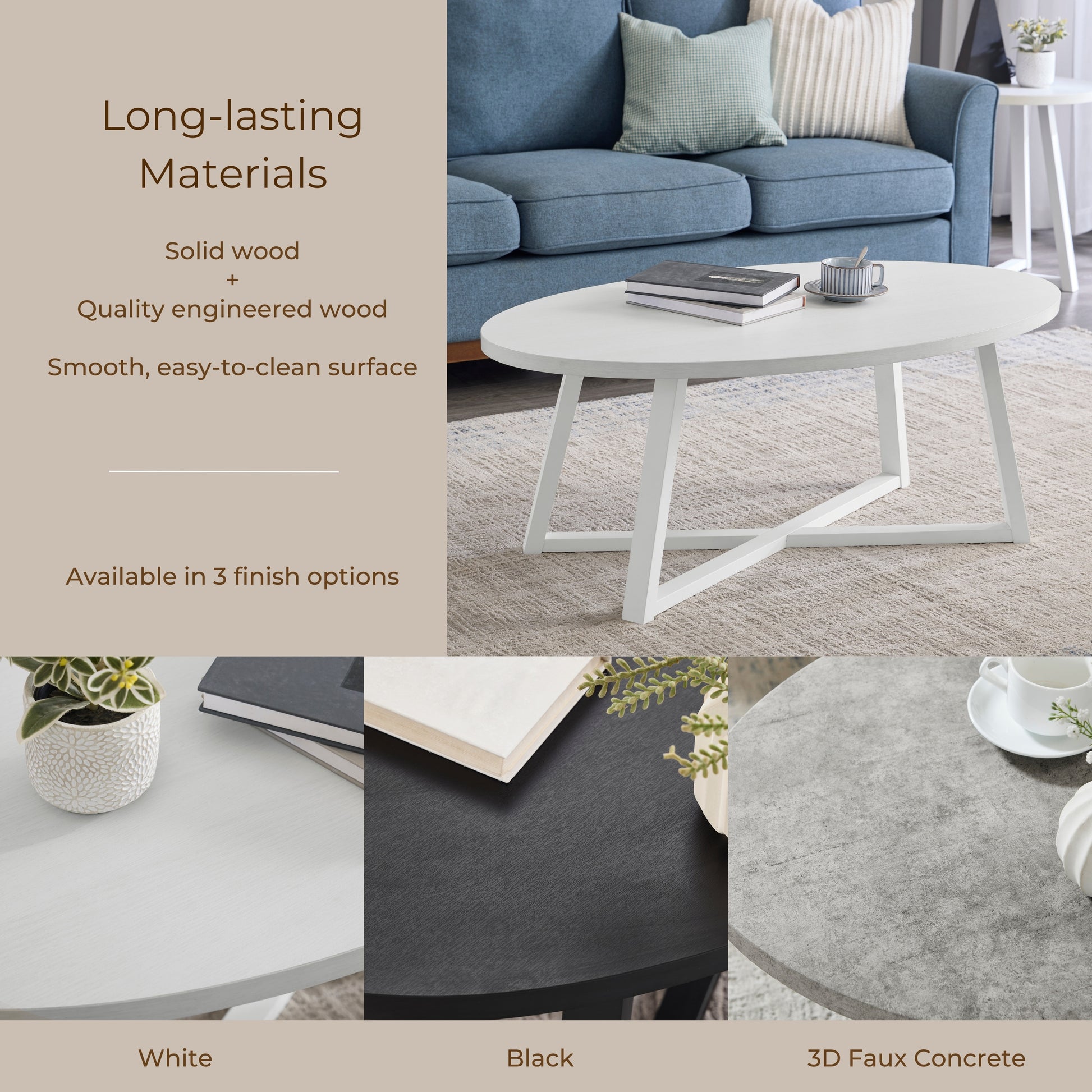 Elevate your living space with the sleek and sophisticated design of the Modern Harmony Oval Coffee Table. Crafted with a contemporary aesthetic, this coffee table features a smooth, oval-shaped tabletop made from durable MDF, offering a refined surface that resists wear and tear. The sturdy, solid rubberwood legs ensure long-lasting stability, while the choice of sleek black, crisp white and faux concrete gray effortlessly complements any décor. Perfect for gatherings or quiet evenings, this table is a harmonious blend of style and function that enhances your home.