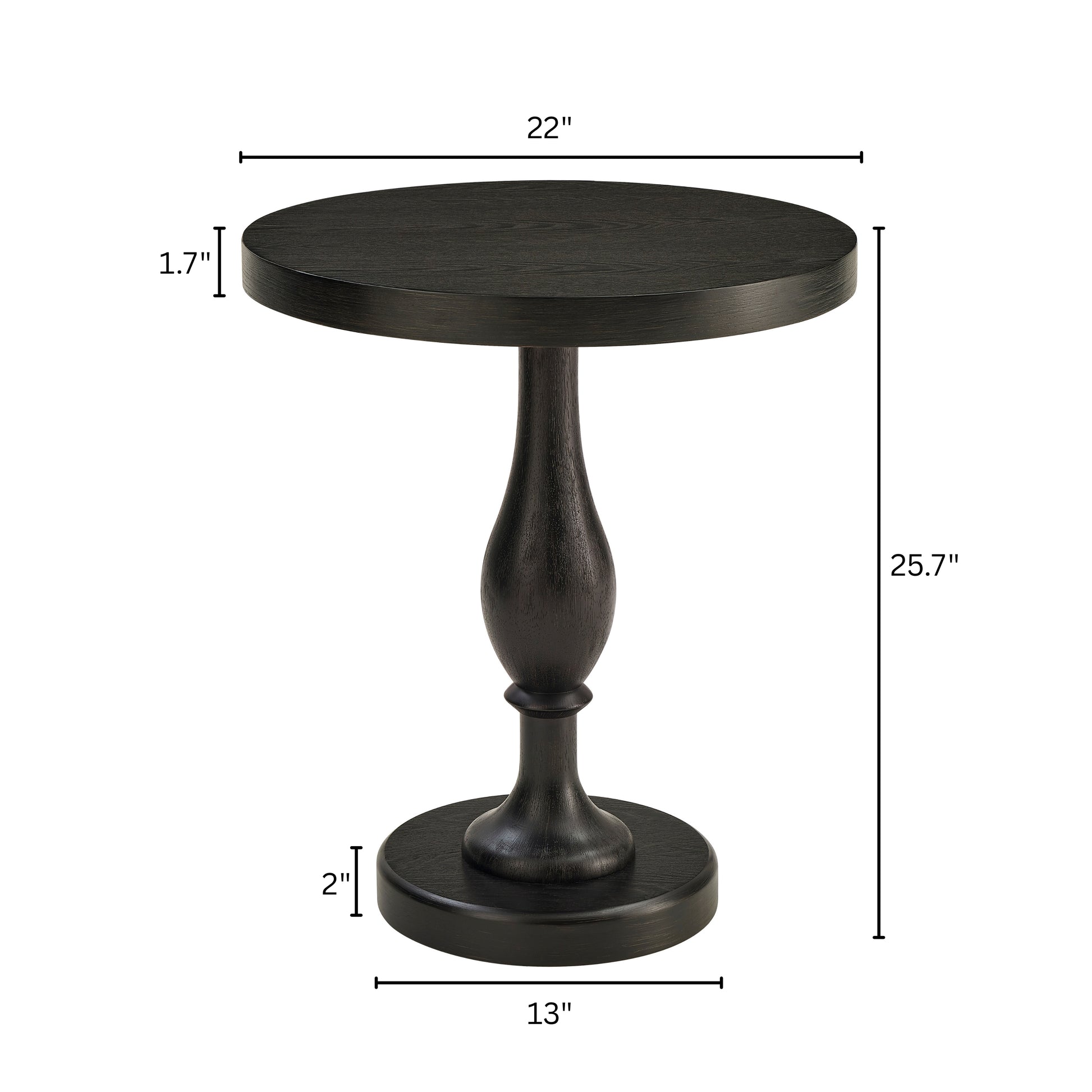 Dimensions: 22"W x 22"D x 25.7"H. Table base diameter: 13". Tabletop thickness: 1.7"