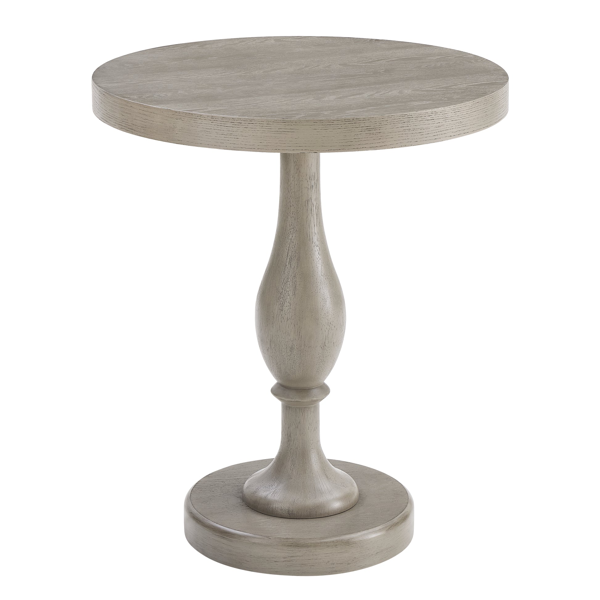 Bring sculptural style and everyday function to your living space with the Solmere 22-inch round end table. Designed with a modern pedestal silhouette, this compact accent table features an MDF top with ash veneer and a solid rubberwood base for dependable strength and stability. The 22" diameter tabletop offers just the right amount of surface space for a lamp, drinks, books, or décor, making it ideal for sofaside placement or small-space living. Available in multiple finishes, this versatile side table blends seamlessly into contemporary, transitional, or apartment interiors while adding warmth and visual depth.
