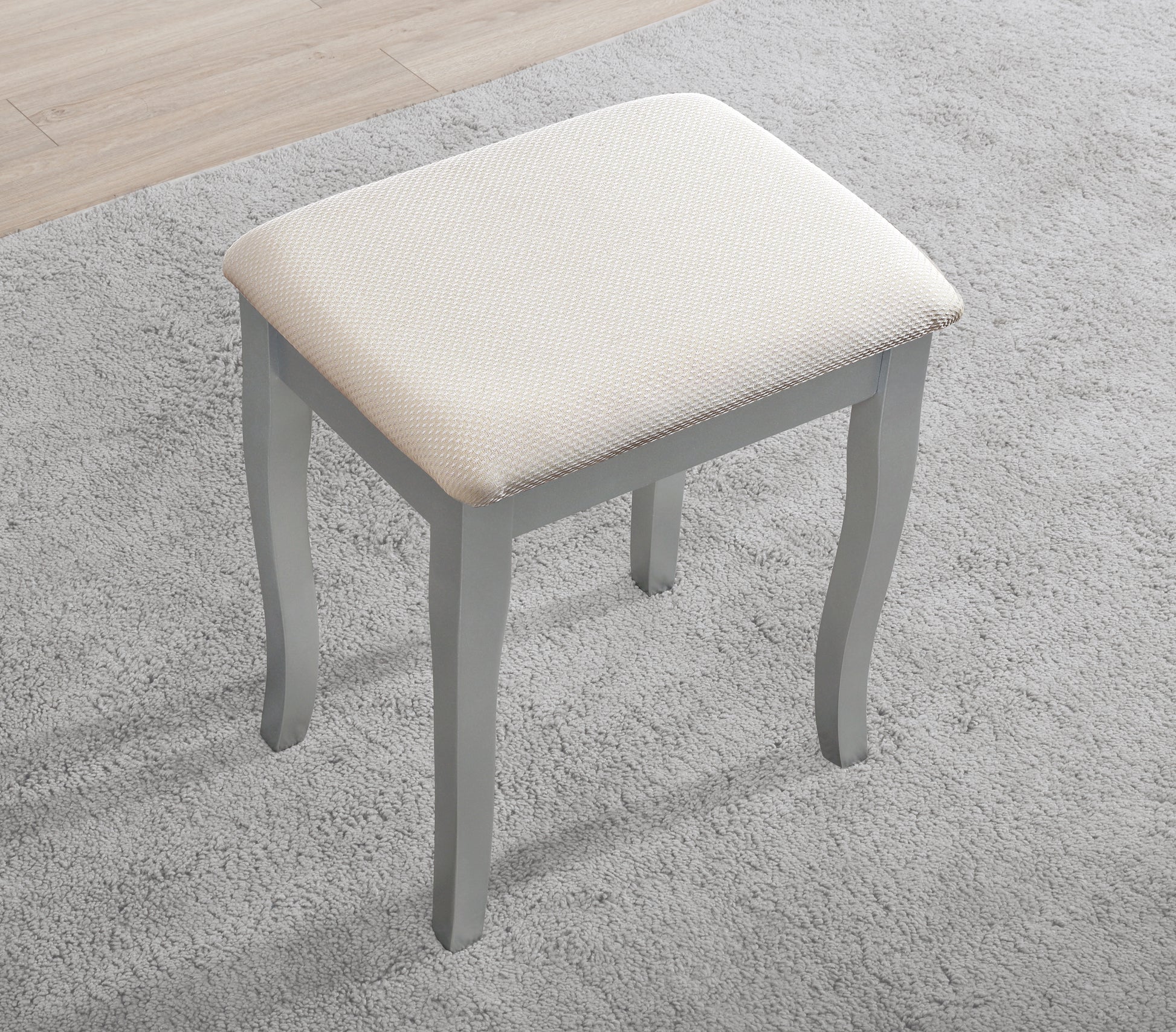 A chic, modern silver finish wooden vanity, it's gonna be an essential piece in your bedroom, as well as a perfect gift! With chair and mirror for galore and quality accents like French and English dovetail joinery make this piece an instant heirloom.