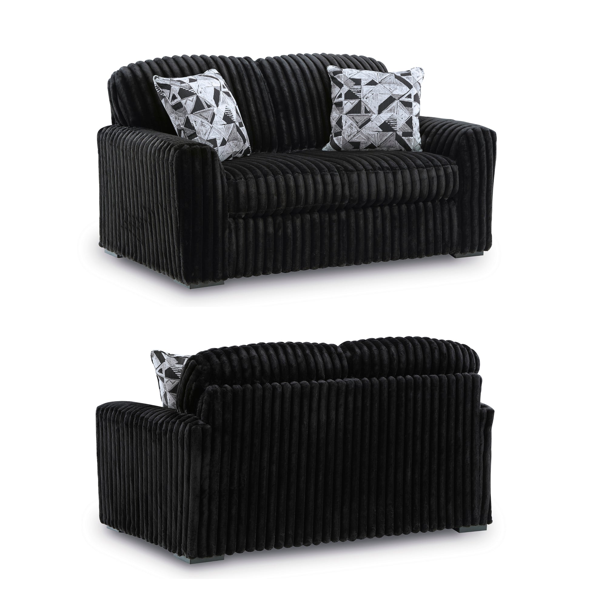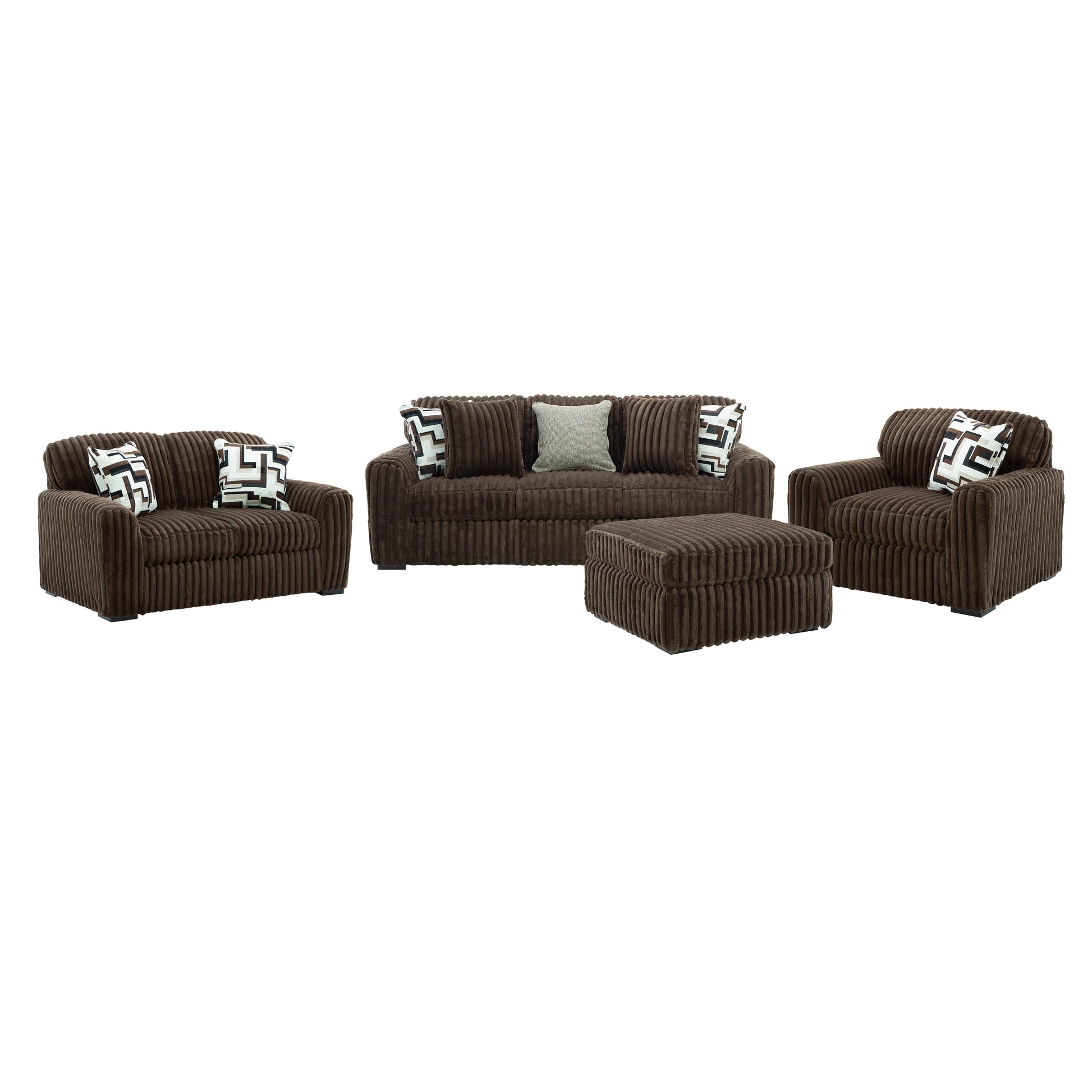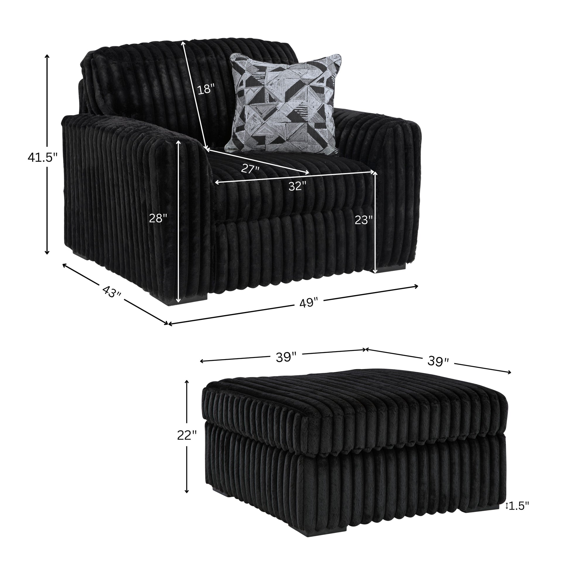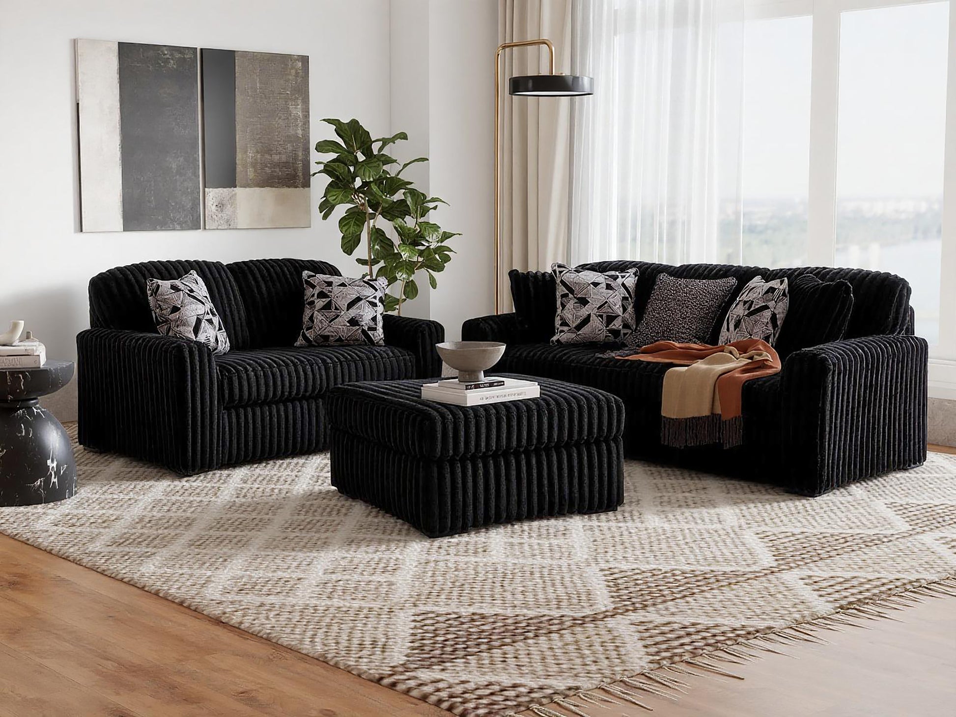 Elevate your living room with cozy comfort and bold style with the Roundhill Furniture Solenne 4-Piece Living Room Set, featuring an oversized sofa, loveseat, chair and a half, and a spacious ottoman. Wrapped in luxuriously soft jumbo corduroy upholstery in a rich onyx black, this collection creates a warm, inviting space perfect for lounging or entertaining. The deep seating, reversible seat cushions, and attached back cushions offer plush, supportive comfort across all seating pieces, while the oversized ottoman serves as a versatile footrest, coffee table, or extra seat. A total of eight oversized 24" toss pillows, complete the look with added texture and softness. Supported by a platform foundation system and low-profile faux wood feet, this set is built to last and maintain its shape and style over time.