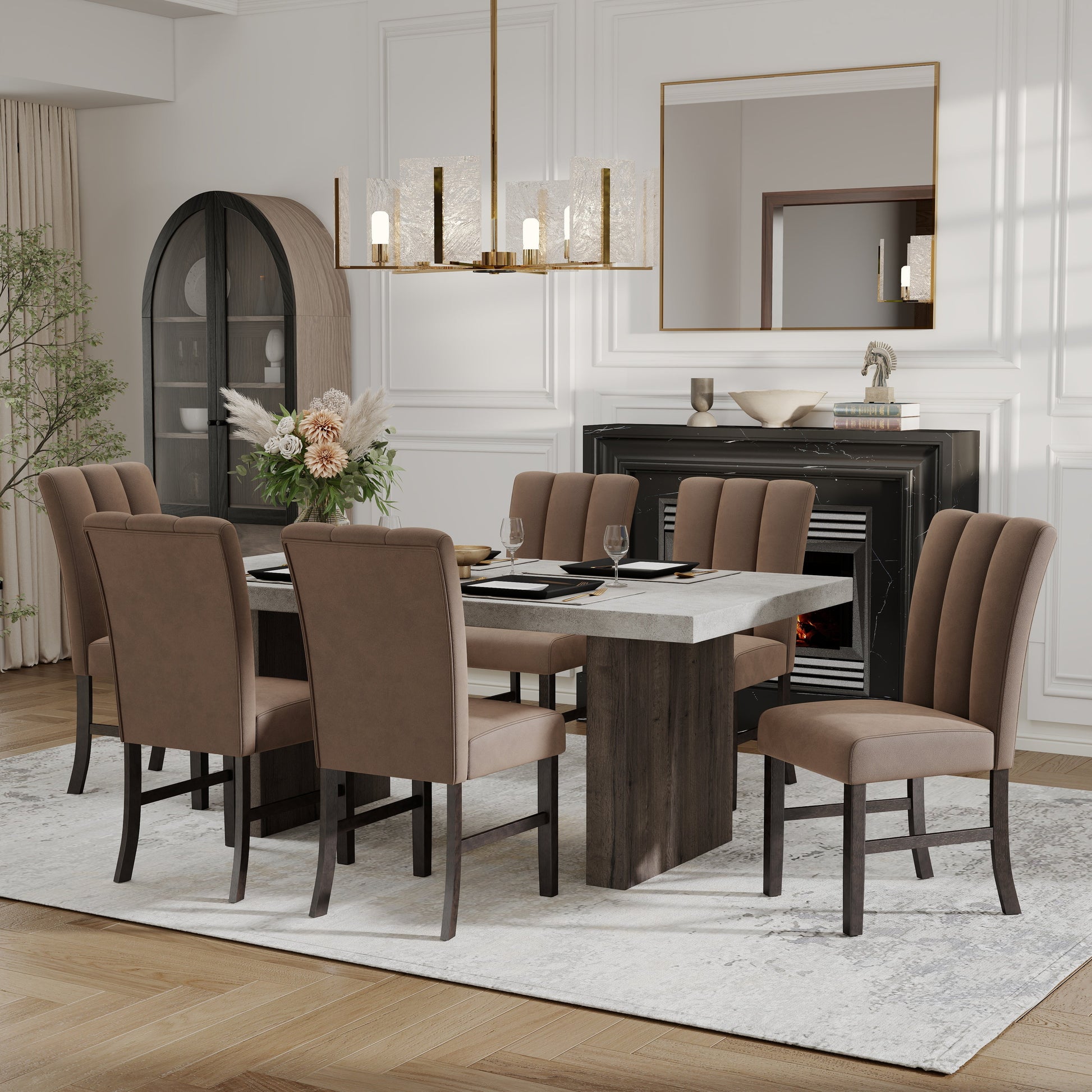 Roundhill Furniture Sorlen 7-Piece Dining Set, 3D Faux Concrete Table with 6 Chocolate Fabric Chairs