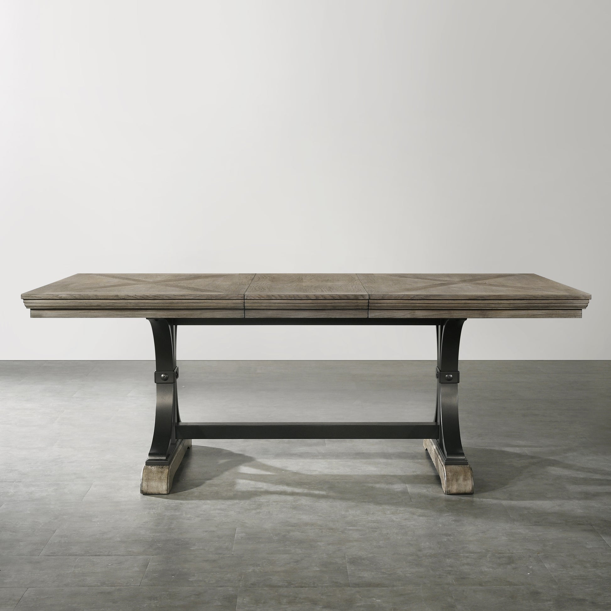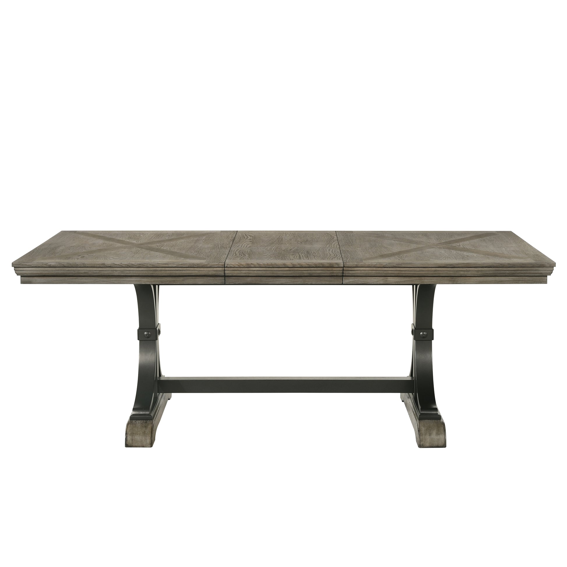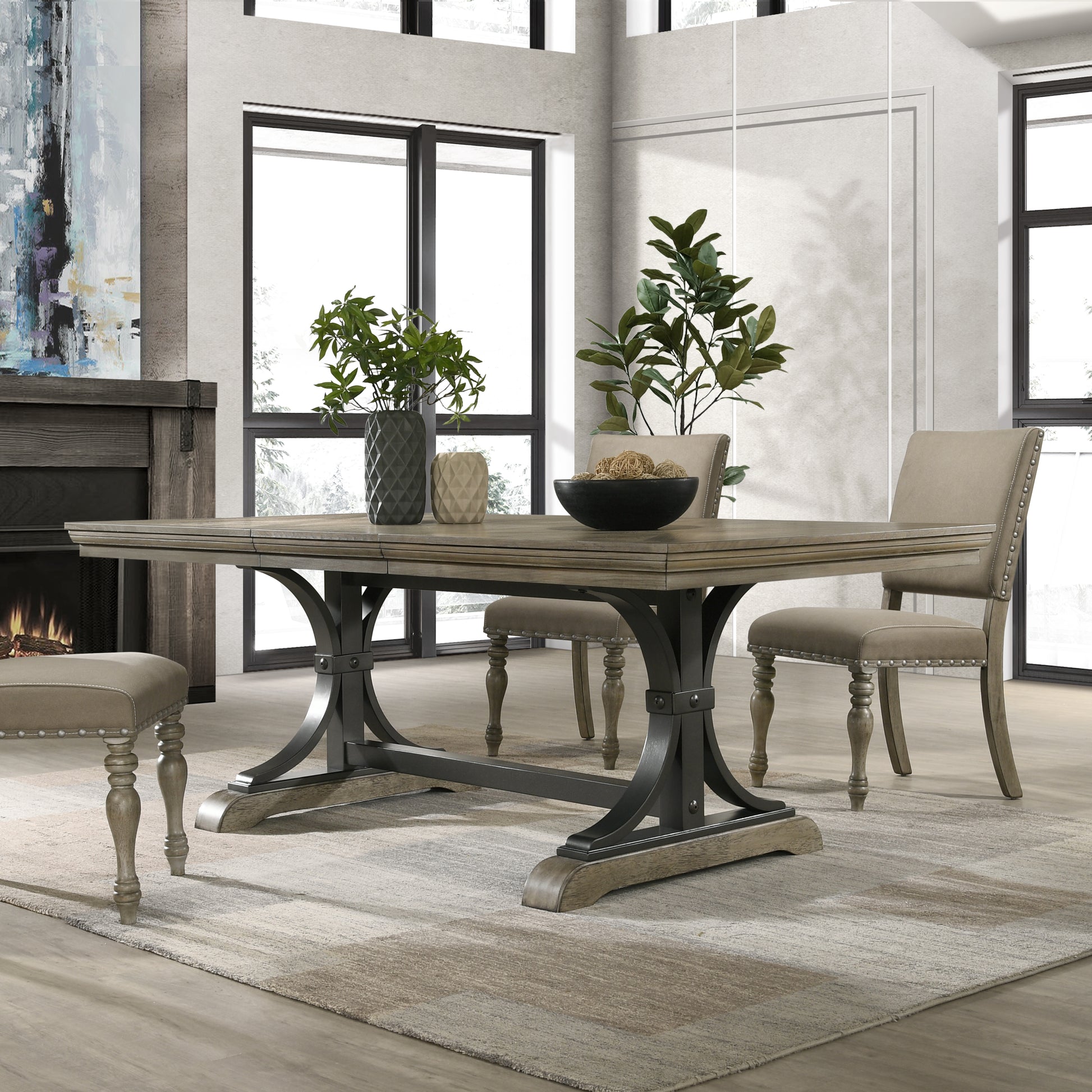 The Dasher Nailhead Driftwood Finish Table brings a rustic-yet-refined charm to all your meals. The rubberwood construction will not expand and contract with varying temperatures and provides superior strength and durability. The curved sturdy wood base gives the table strong support and made it a long-lasting piece. Driftwood-finished accents add a rustic touch, and the table's complete with an 18" wide extension leaf, which makes room for eight people.