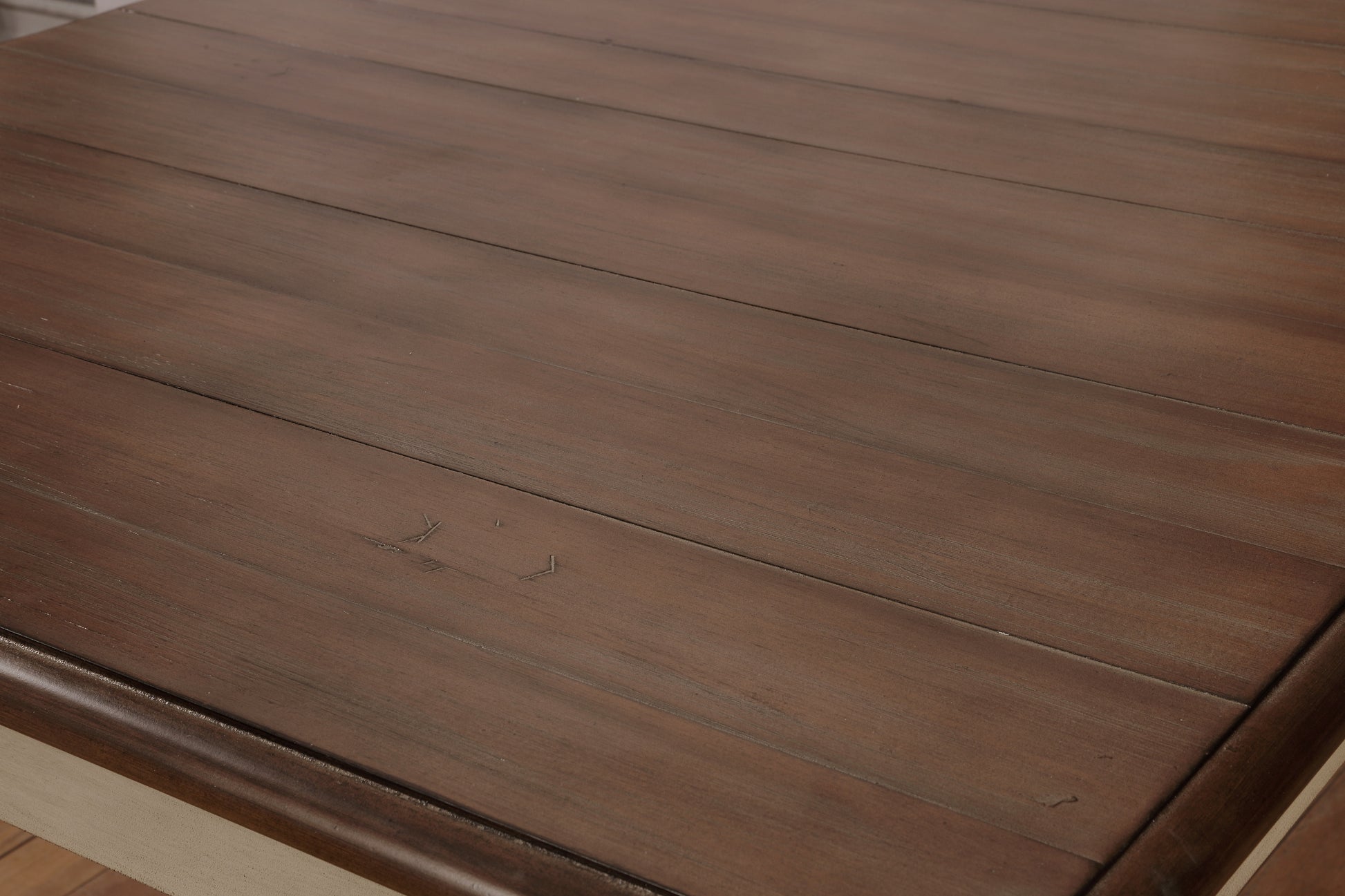- Casual, traditional dining table with up to 6 matching chairs. Hardwood solids, engineered wood, and veneers finished in white and distressed oak.