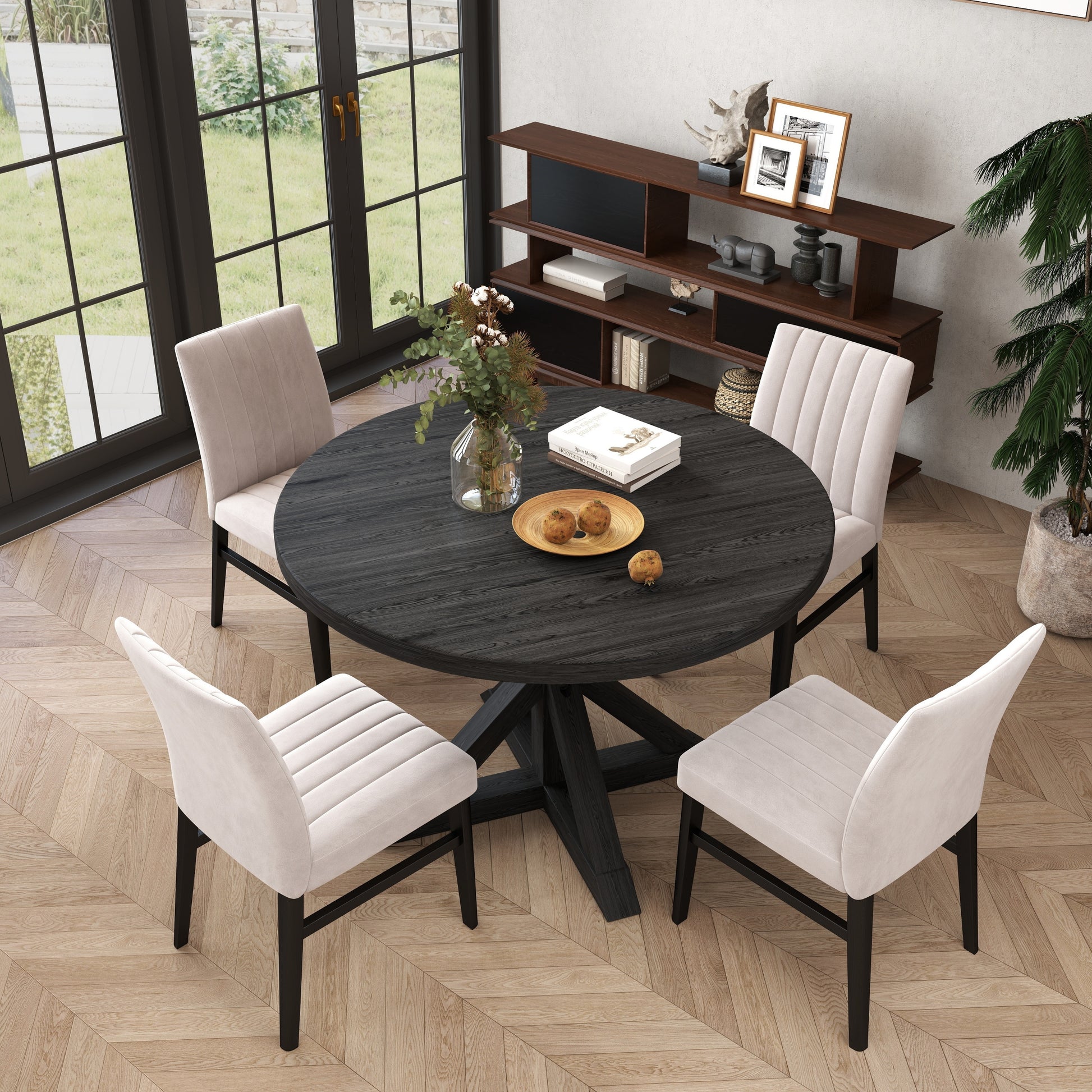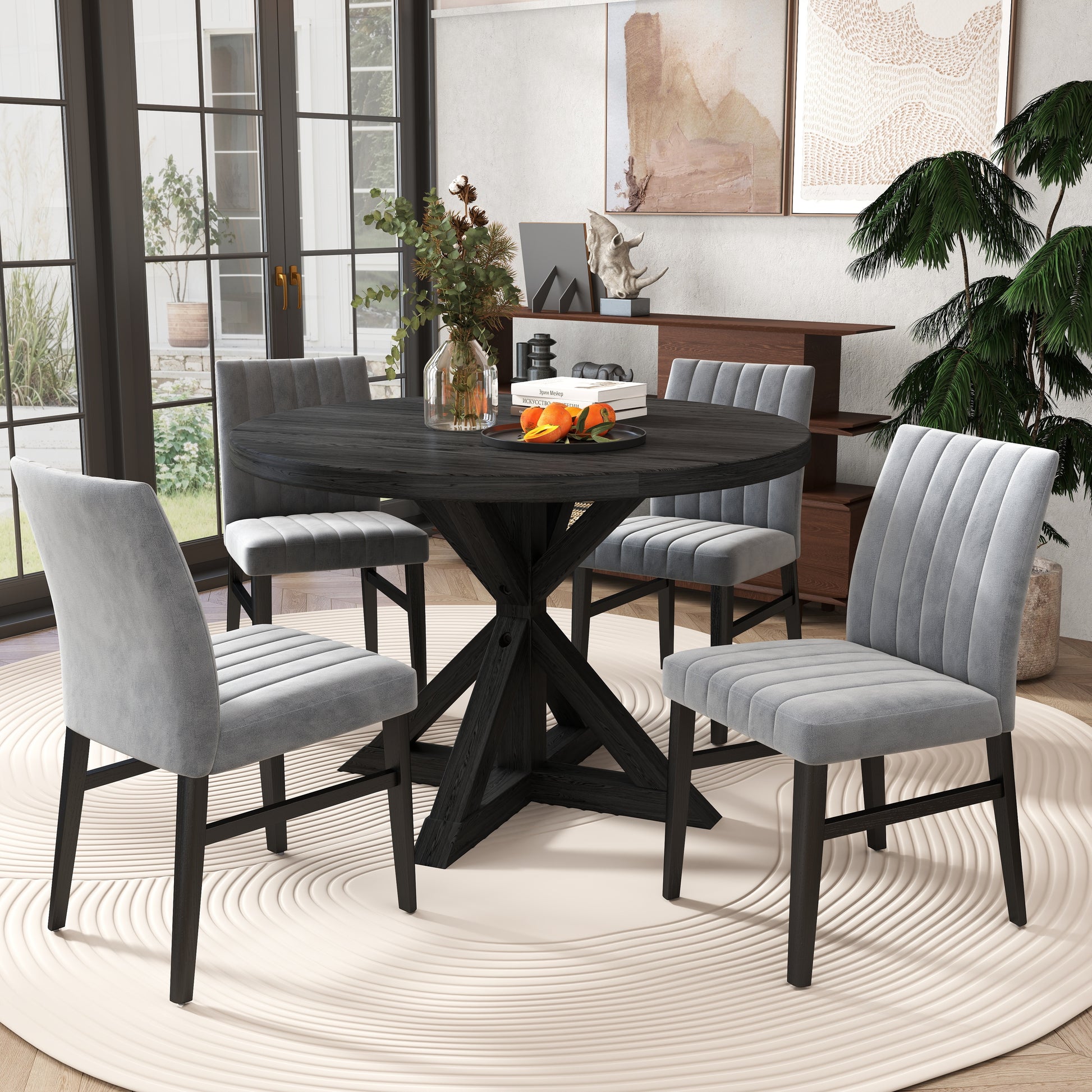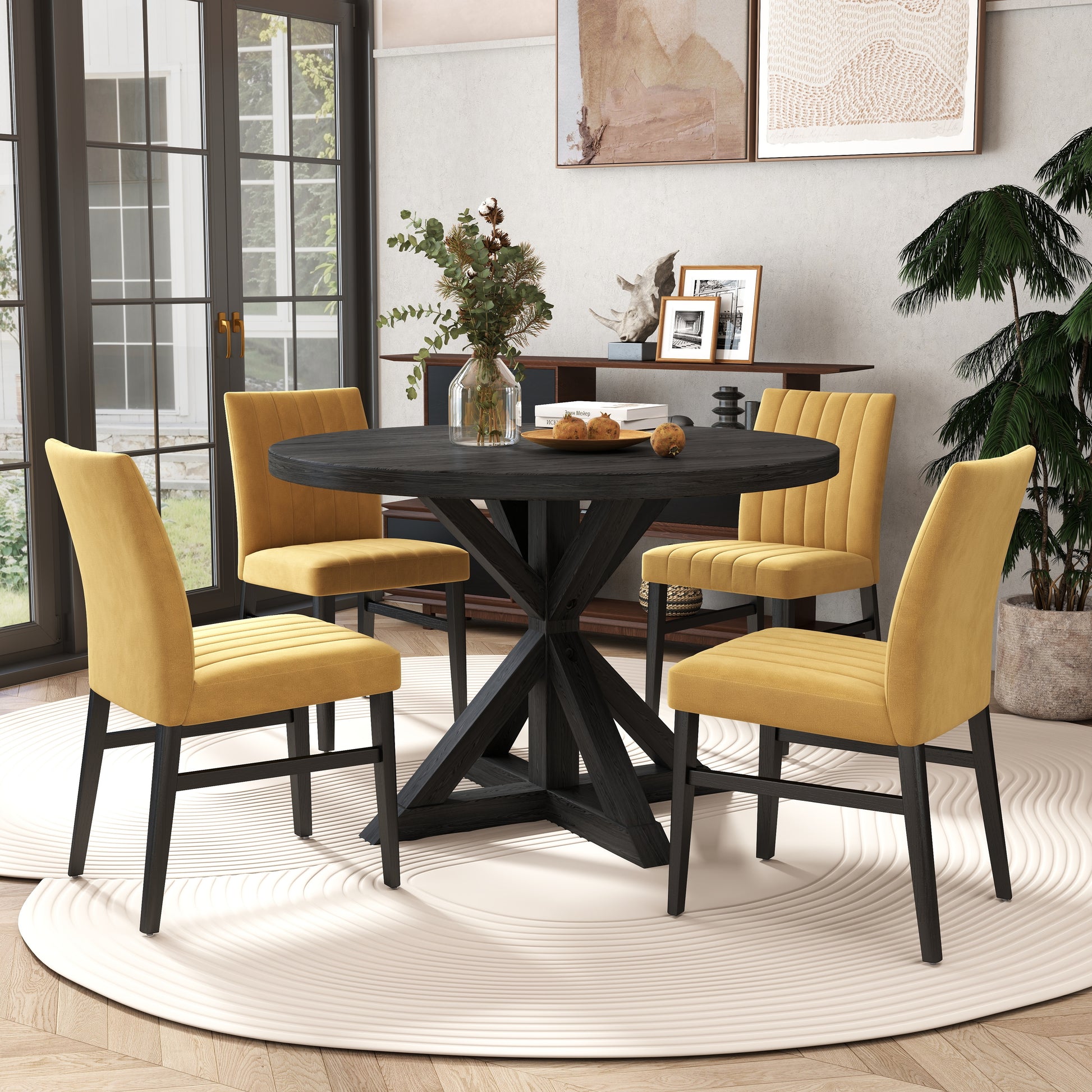 Crafted with durability in mind, the dining table with a cross-buck pedestal base finished in a rich black with beautiful wood grain texture is sure to impress your guests. The table top made of oak veneers and engineered wood, and the table base made of solid rubberwood, ensure long-lasting durability. The infusion of wood veneers adds dramatic, modern farmhouse character to the design. The chairs are designed with padded seats and backs, providing optimal comfort for your dining experience. The channel-tufted detailing on the chairs adds an extra layer of elegance.