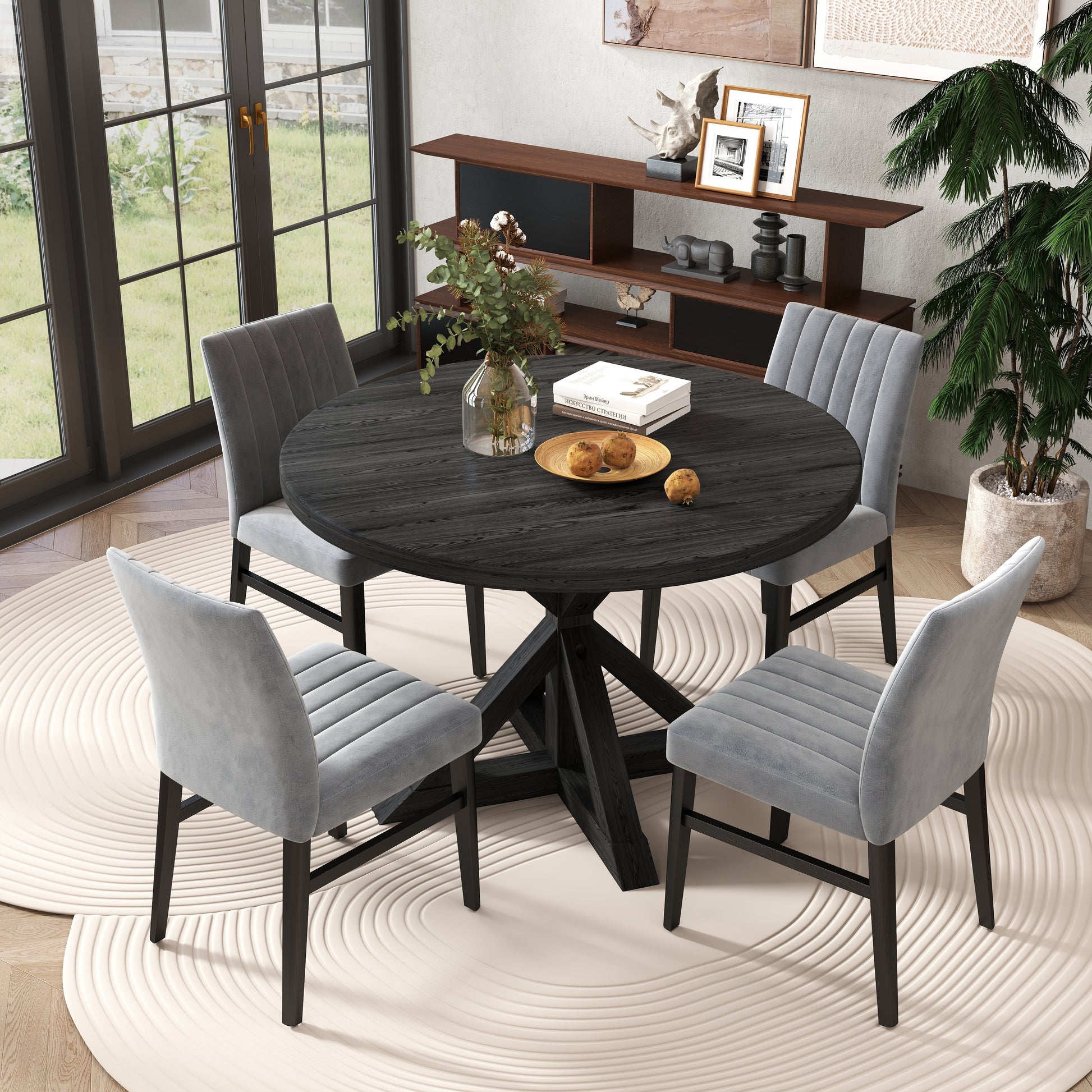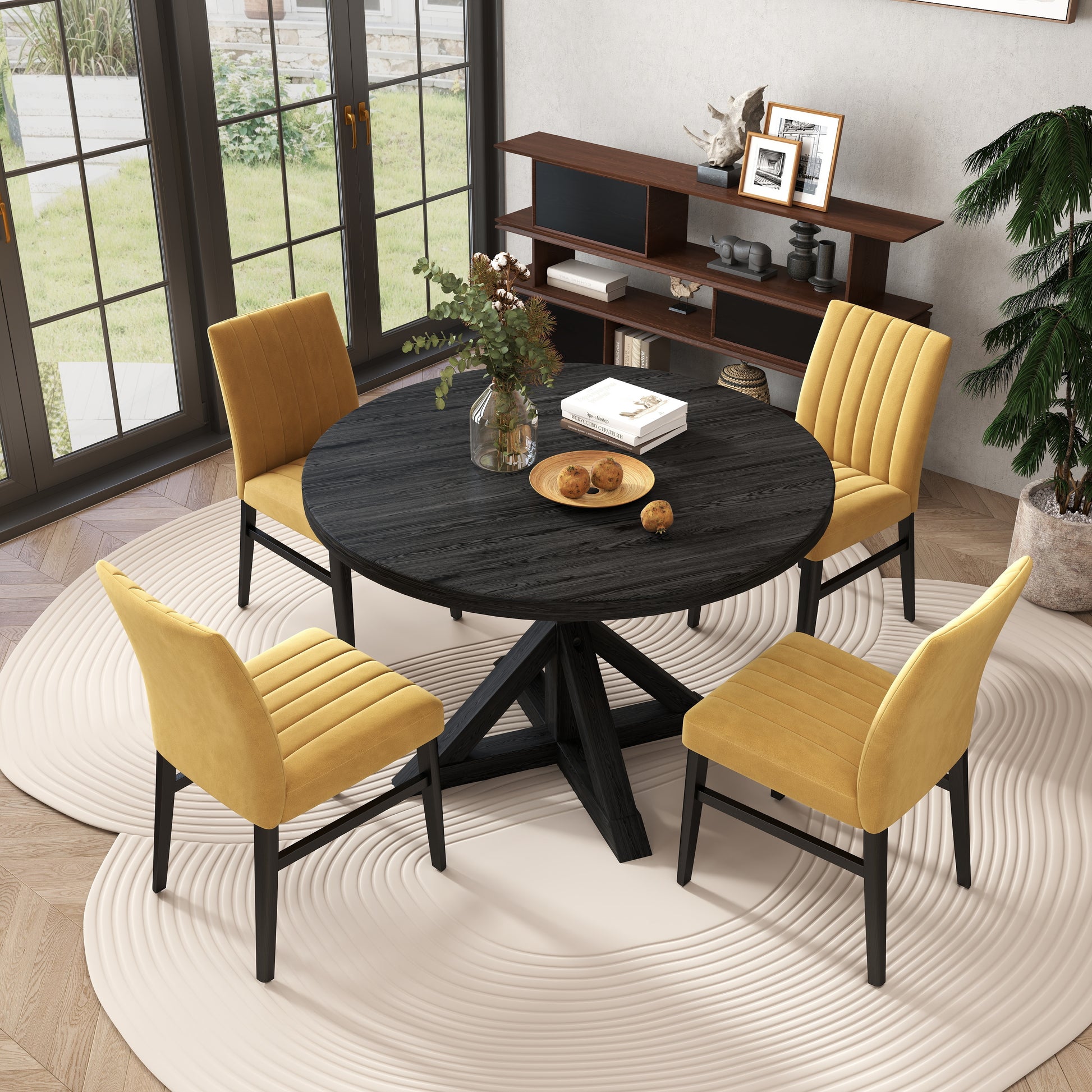 - [CROSS-BUCK PEDESTAL TABLE]: The dining table has a round shape creates a intimate atmosphere, while the cross-buck pedestal base adds both stability and style. The tabletop is made of oak veneers and engineered wood, while the table base is constructed with rubberwood for long-lasting durability. With a rich black finish and wood grain texture, the table exudes elegance.