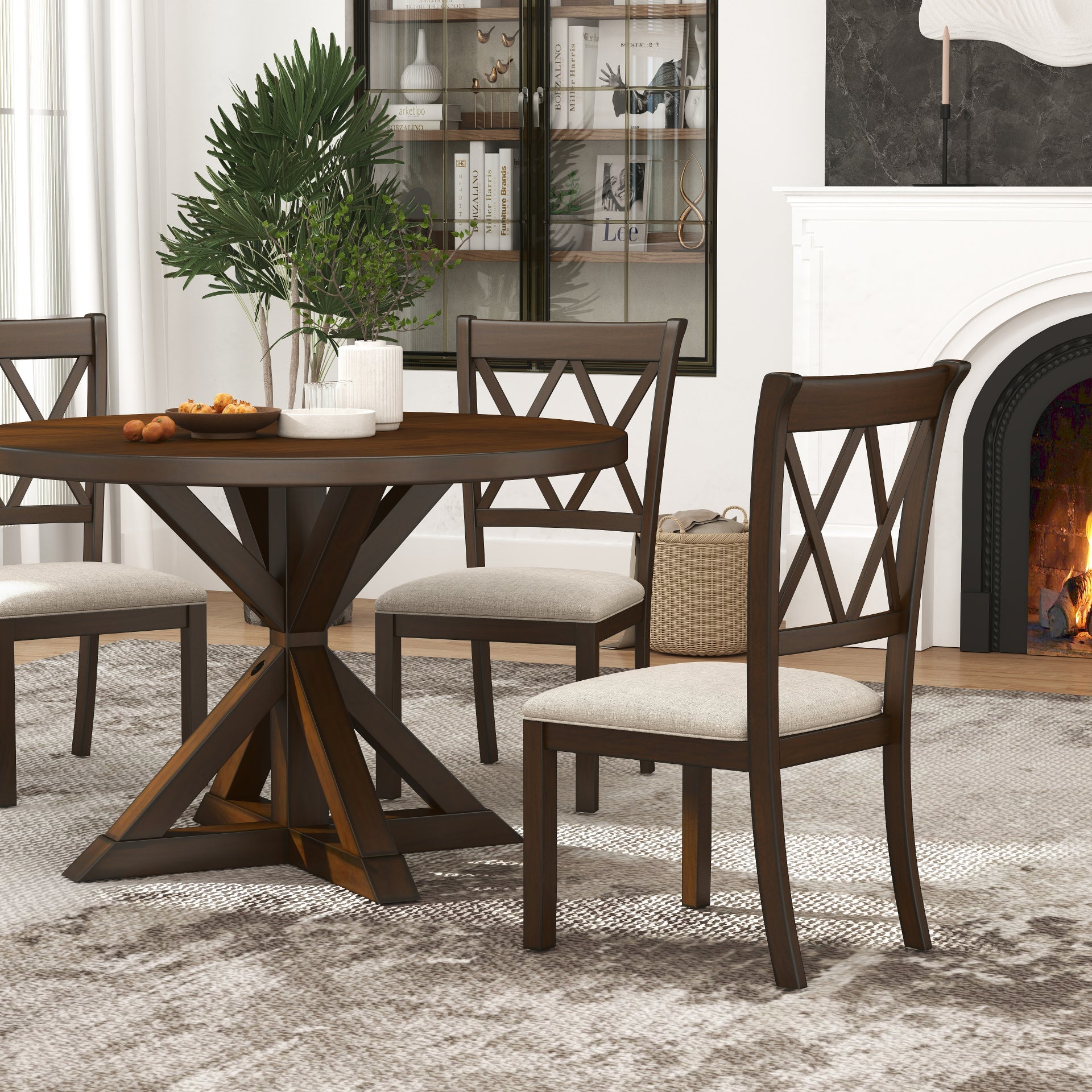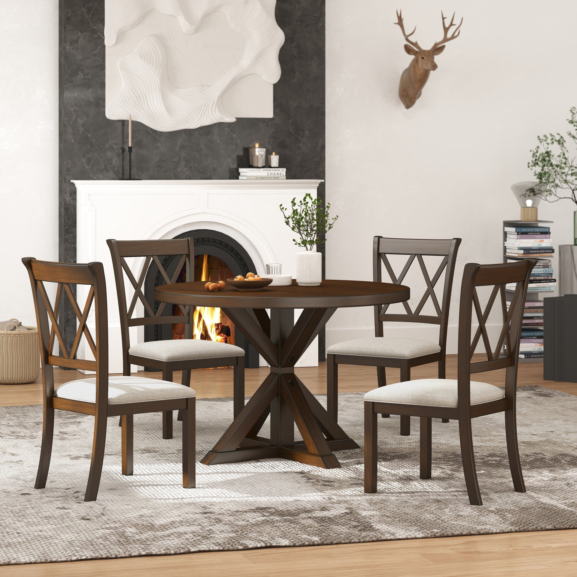 Windvale 5-Piece Dining Set, Cross-Buck Round Table with 4 Stylish Chairs