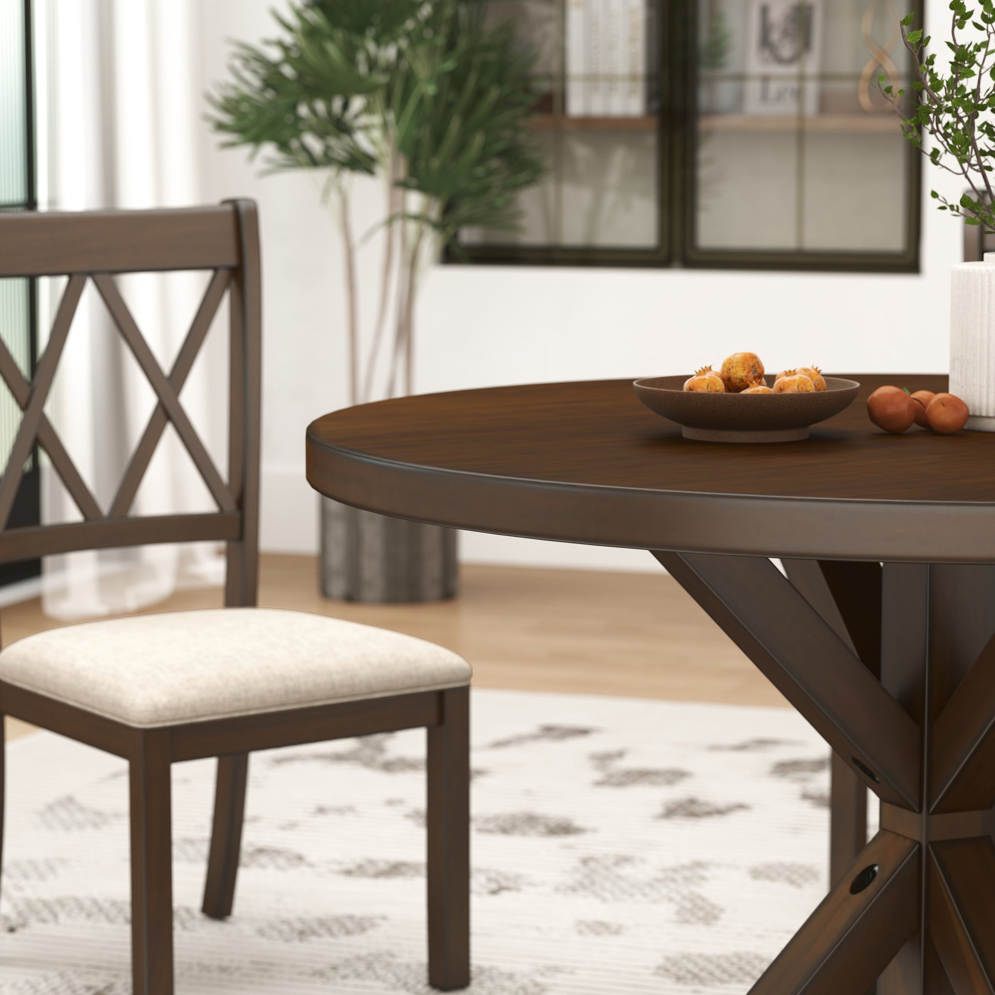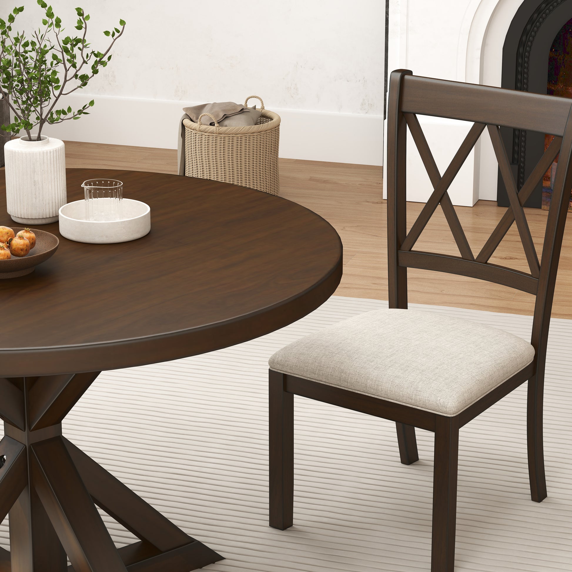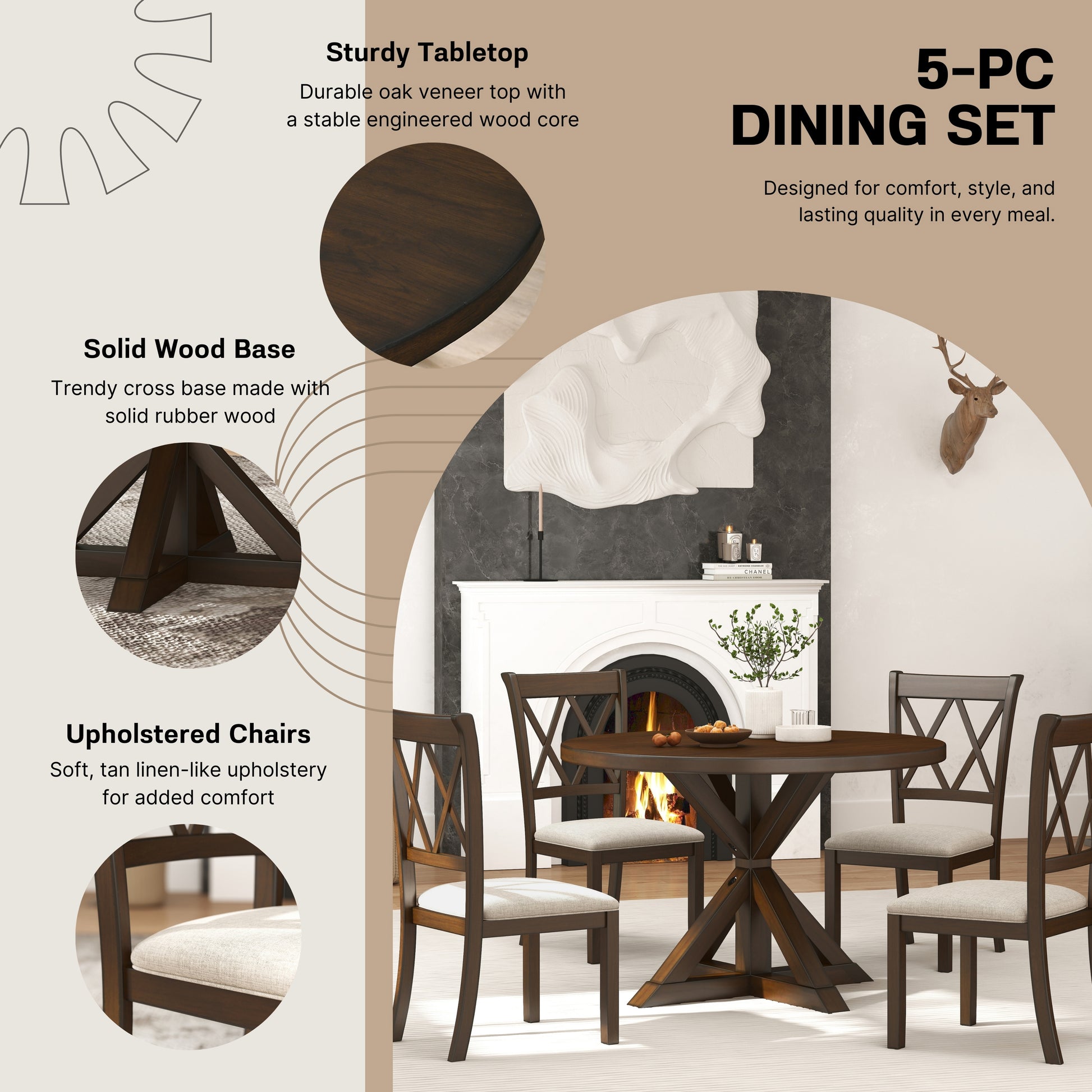 The round dining table with a cross-buck pedestal base with beautiful wood grain texture is sure to impress your guests. The table top made of oak veneers and engineered wood, and the table base made of solid rubberwood, ensure long-lasting durability. The chairs, featuring a cross-back design and finished in a matching color, perfectly complement the table's aesthetic. Built with solid rubberwood, these chairs guarantee long-lasting support. The cushioned seats, adorned with tan linen-look upholstery, offer both elegance and comfort.